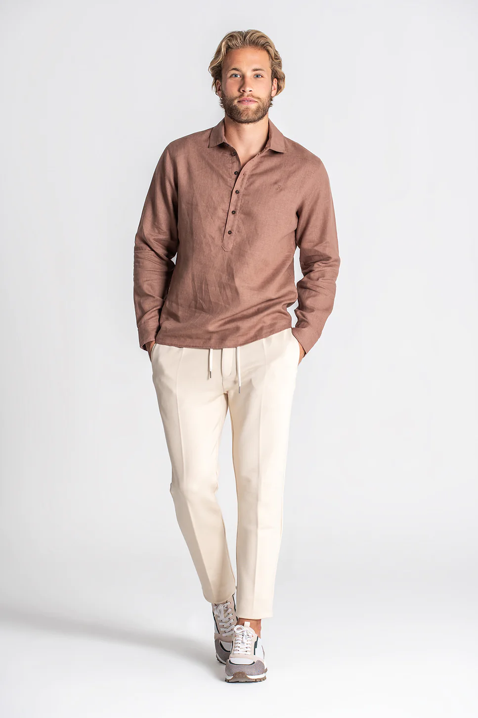 Camisa em tom castanho com uma estética natural e sofisticada, pensada para um look leve mas com presença. O corte confortável, aliado ao colarinho clássico e à abertura frontal com botões, garante um visual cuidado sem esforço.