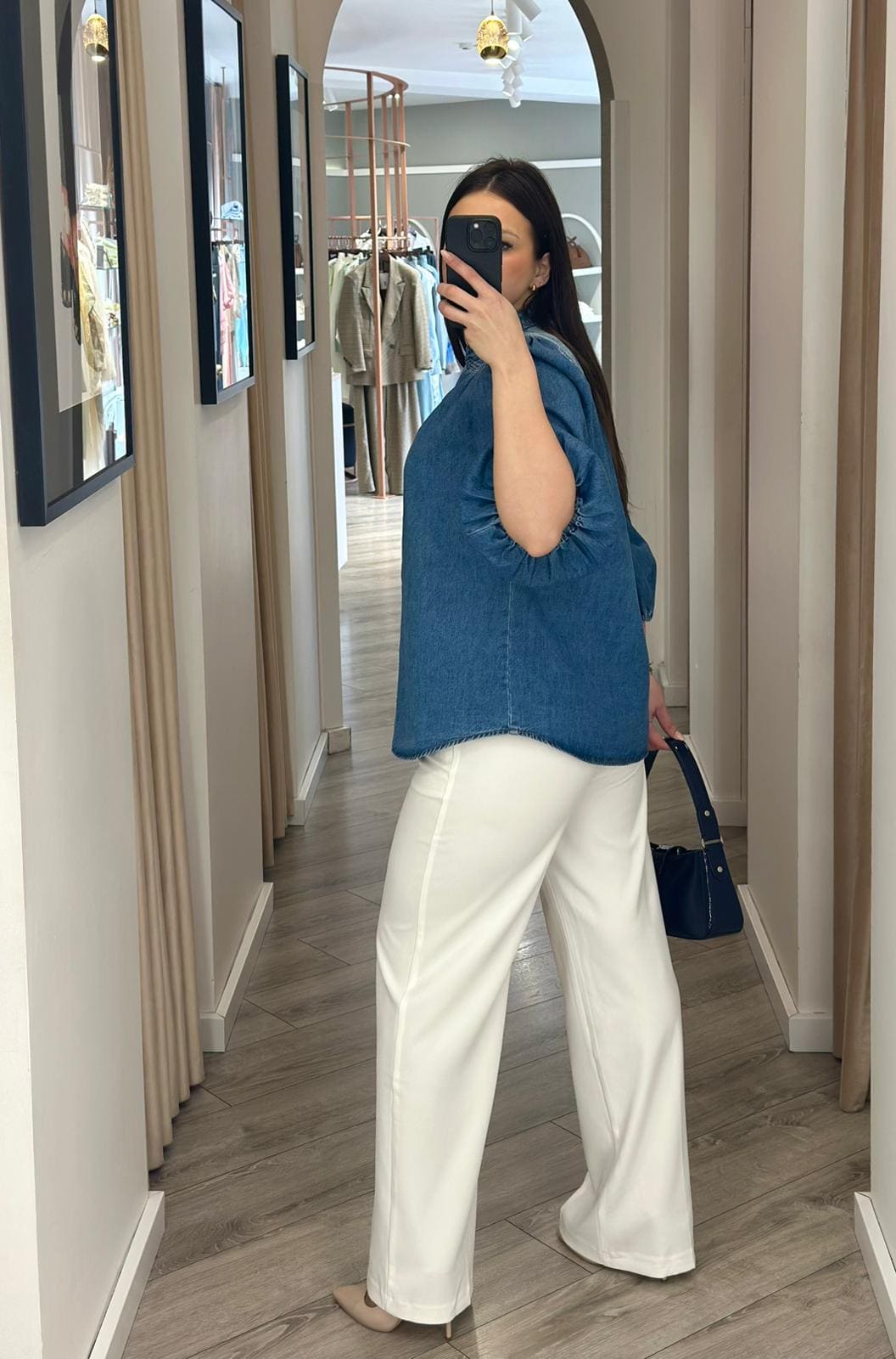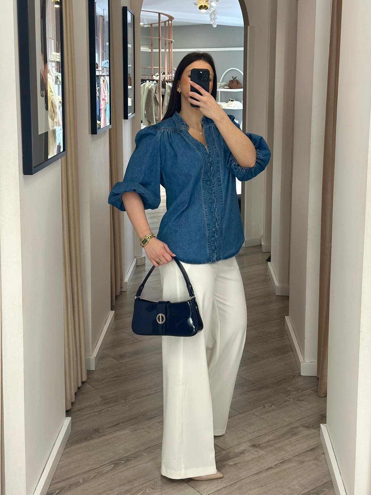 Camisa em ganga azul de inspiração contemporânea, uma peça que reinventa o clássico denim com uma silhueta feminina e estruturada.