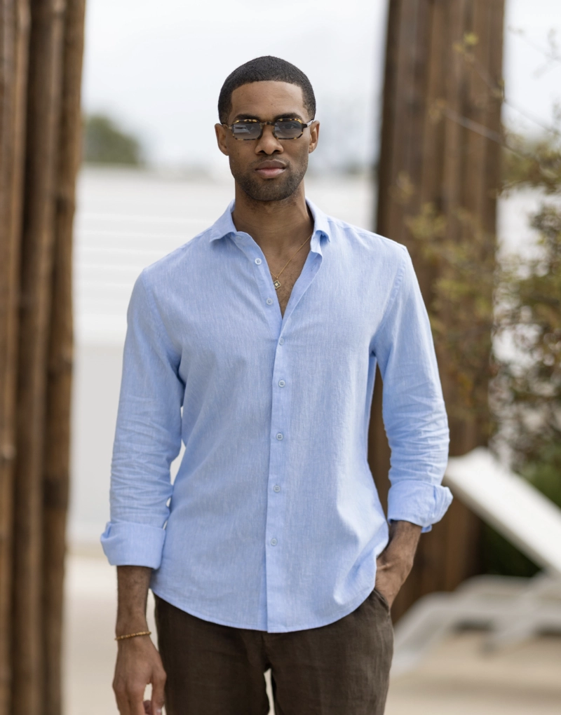 Camisa em tecido leve com mistura de linho e algodão, num tom azul claro fresco e elegante, perfeita para os dias mais quentes. A composição de 55% linho e 45% algodão garante respirabilidade, conforto e um toque naturalmente sofisticado.