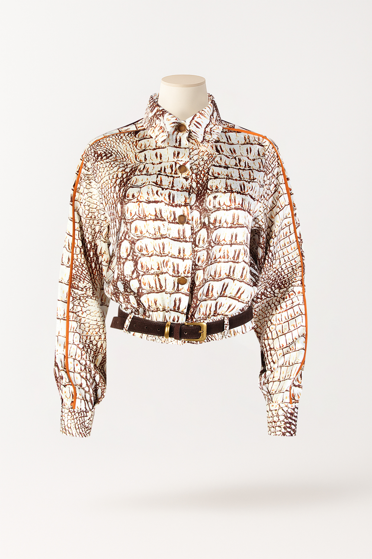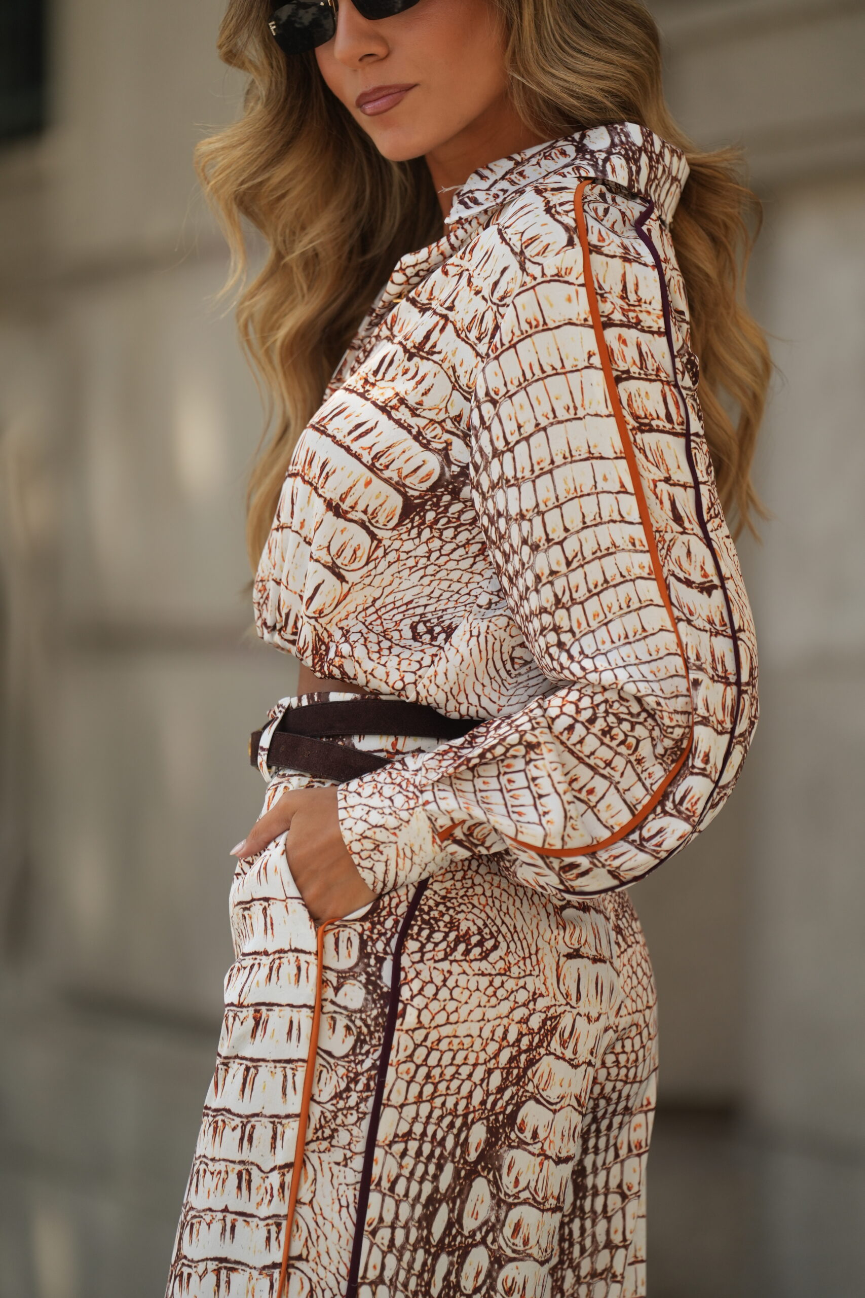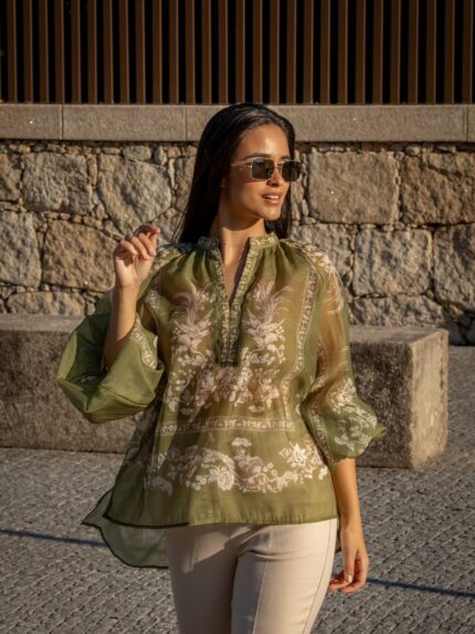 Perfeita para coordenar com calças de cintura subida ou saias midi, a camisa Sahoco padrão crocodilo é uma aposta segura para looks que respiram confiança e autenticidade.