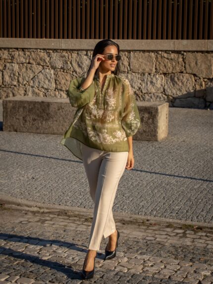 Com gola clássica e fecho frontal em botões, é uma peça que combina praticidade com impacto visual. O detalhe nas mangas com debrum contrastante acrescenta ainda mais personalidade ao design.