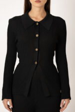 CAMISA PRETA EM MALHA CANELADA. MANGA COMPRIDA. GOLA EM RIB. ABOTOA NA FRENTE COM BOTÕES DOURADOS. 100% VISCOSE