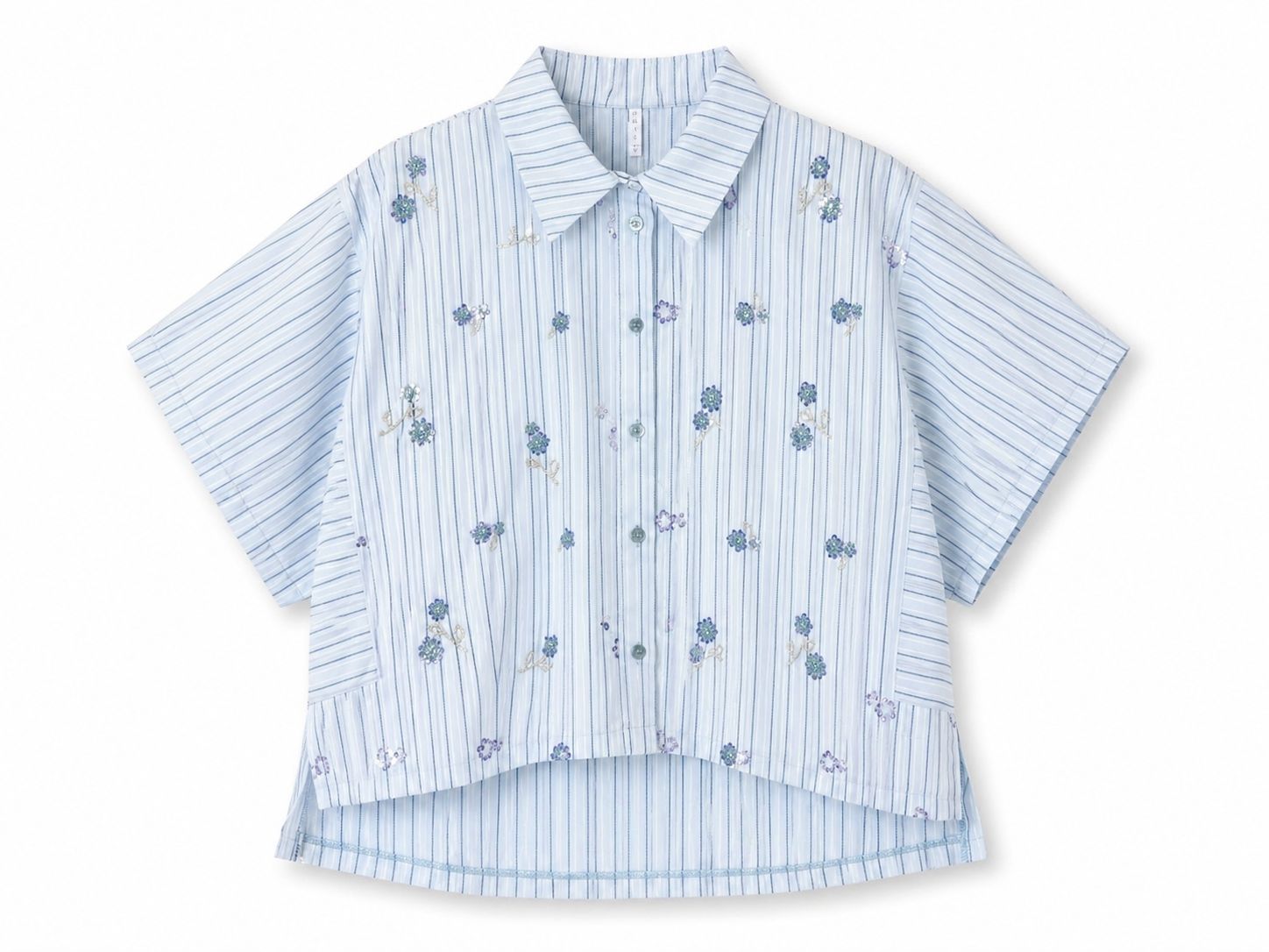 Camisa leve em tom azul suave com padrão de risca fina, enriquecida por delicados bordados florais e subtis aplicações de lantejoulas que conferem um toque luminoso e sofisticado. Confeccionada com uma mistura equilibrada de 45% algodão, 45% poliéster e 10% viscose, garantindo conforto e fluidez no uso.