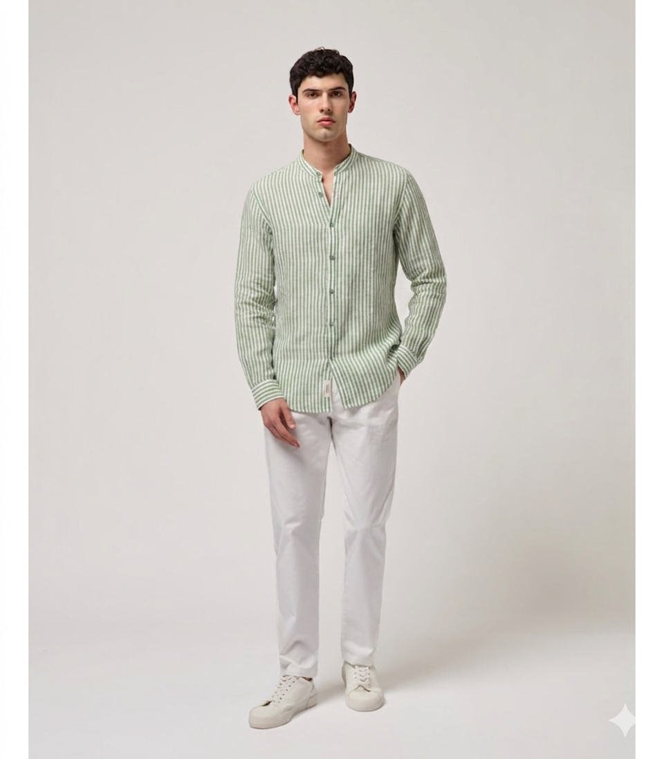 Moderna, fresca e cheia de personalidade. Esta camisa Gianni Lupo combina o padrão de risca vertical verde e branca com uma elegante gola padre, criando um visual mais contemporâneo e diferenciador.