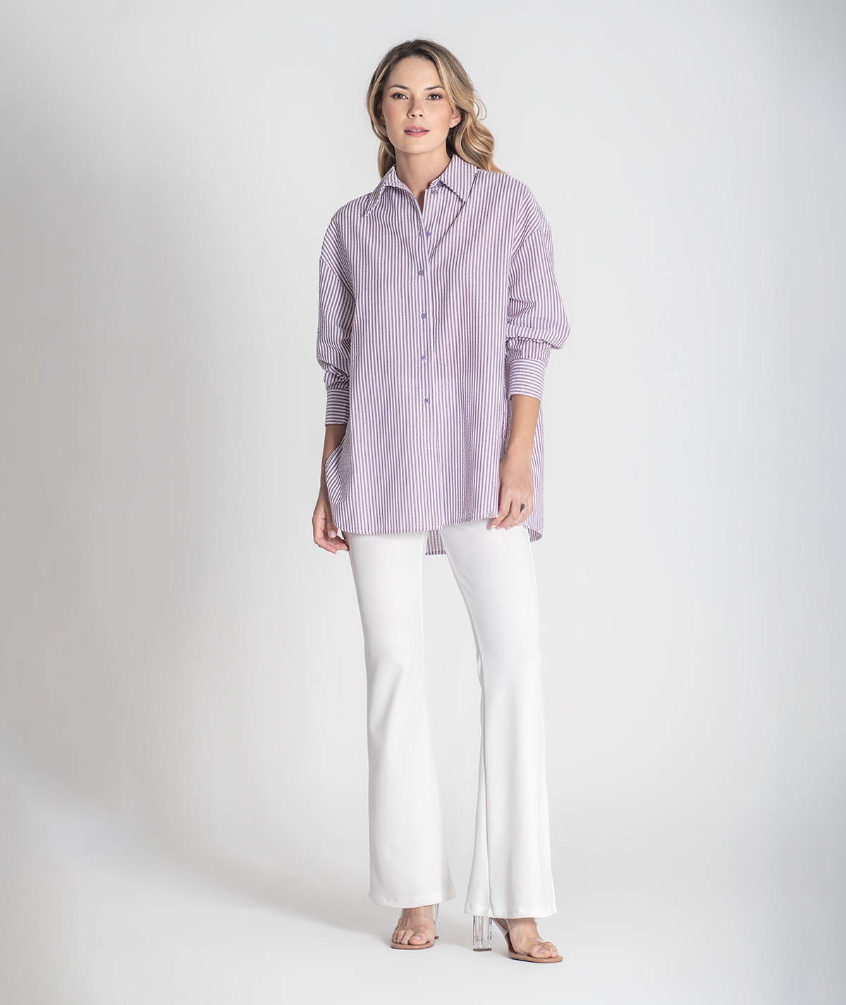 Camisa oversize riscas. Aperta na frente com botões.