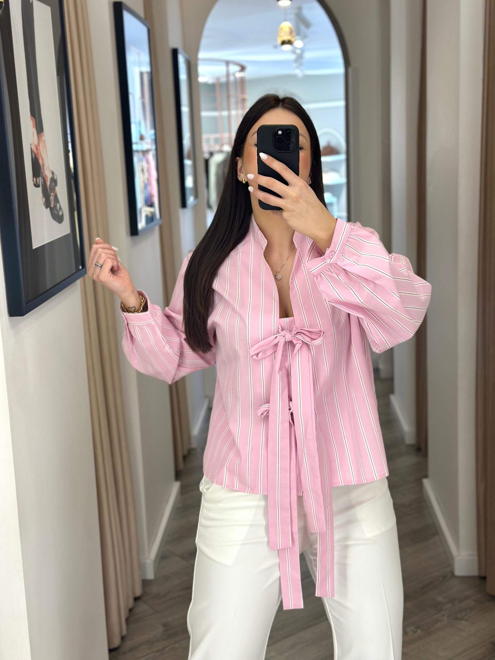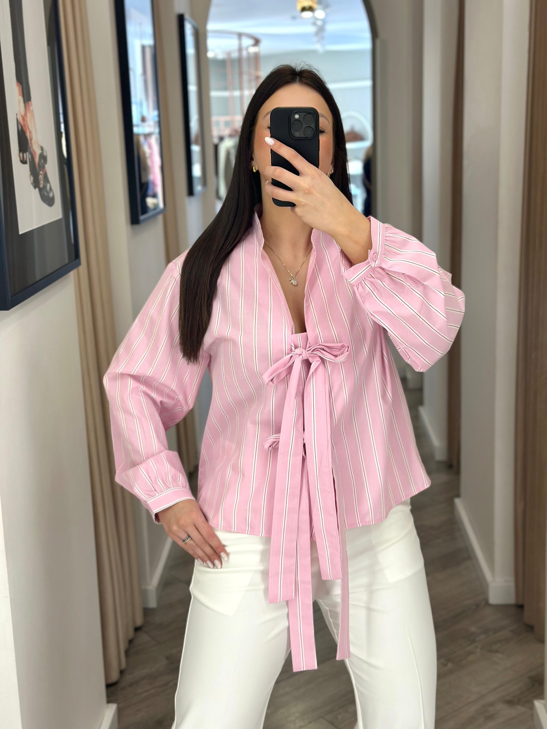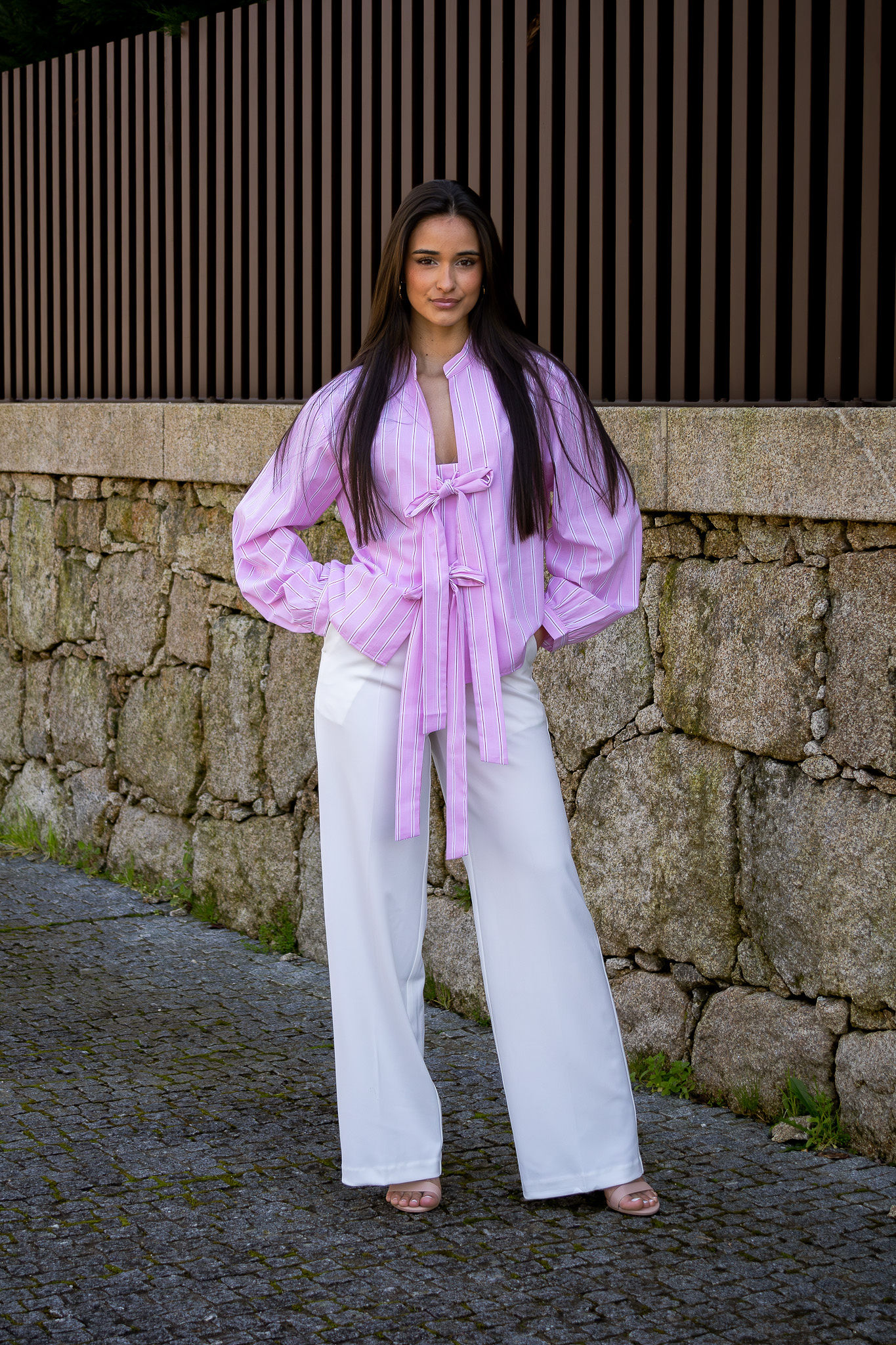 Uma camisa leve e super feminina, em rosa bebé com riscas verticais brancas que alongam a silhueta e dão um ar mais elegante ao look. O destaque vai para o fecho frontal com laços, um detalhe delicado e diferente que transforma uma peça clássica em algo especial.