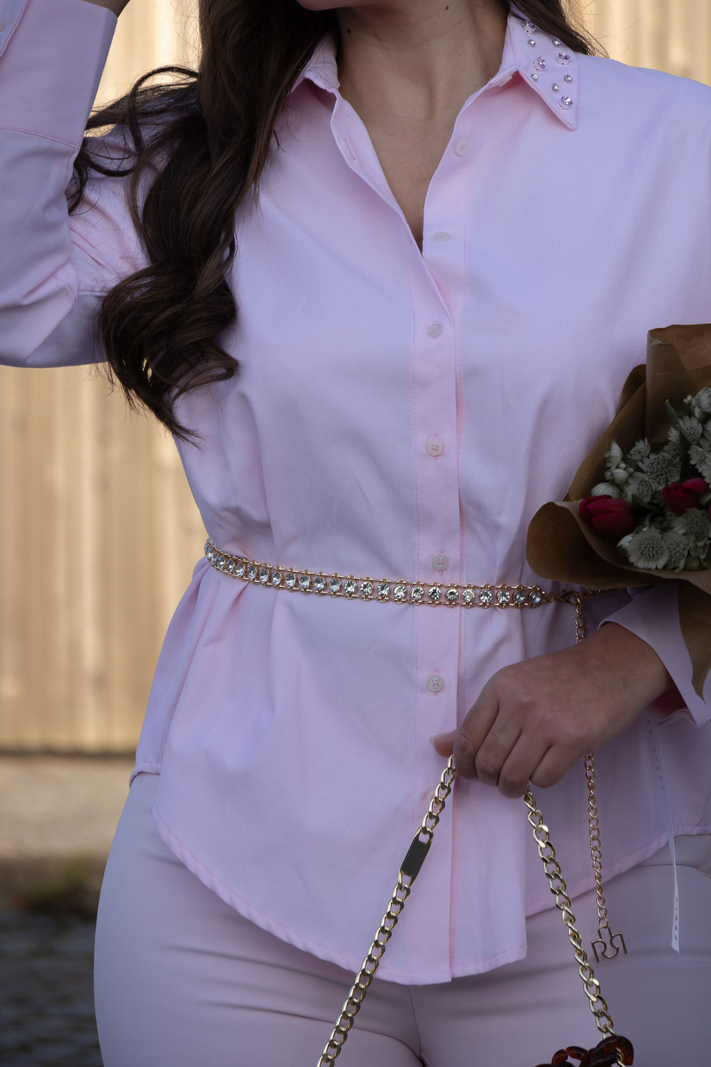 Delicada, feminina e com um toque de brilho subtil. Esta camisa rosa destaca-se pela gola clássica adornada com aplicações de pedraria em tons cristal e rosé, que iluminam a peça e elevam instantaneamente qualquer coordenado.