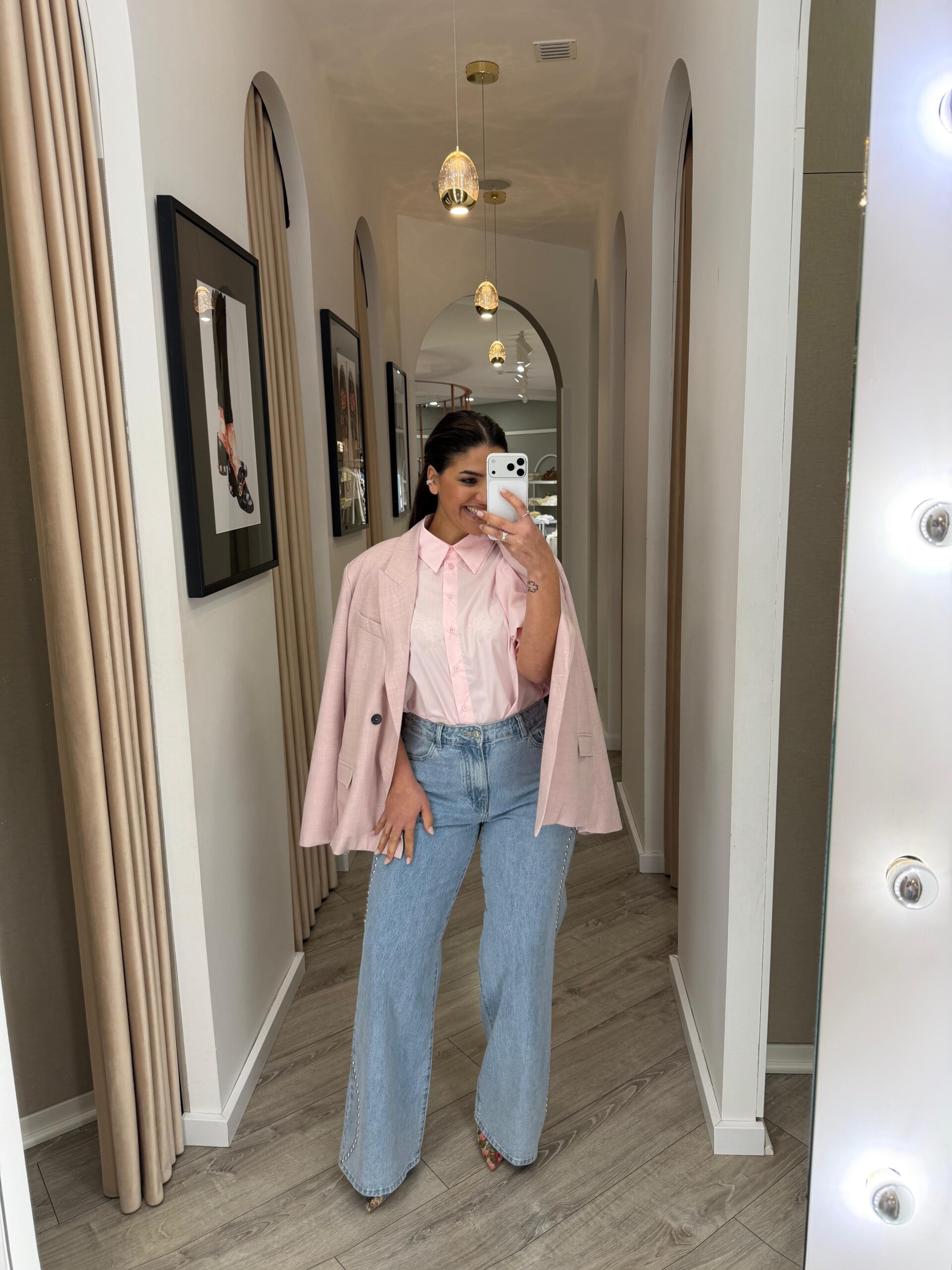 Uma camisa rosa que dá um twist ao clássico. Com corte moderno e silhueta ligeiramente curta, destaca-se pelas mangas volumosas com efeito balão e detalhe franzido, criando um visual feminino e super atual.