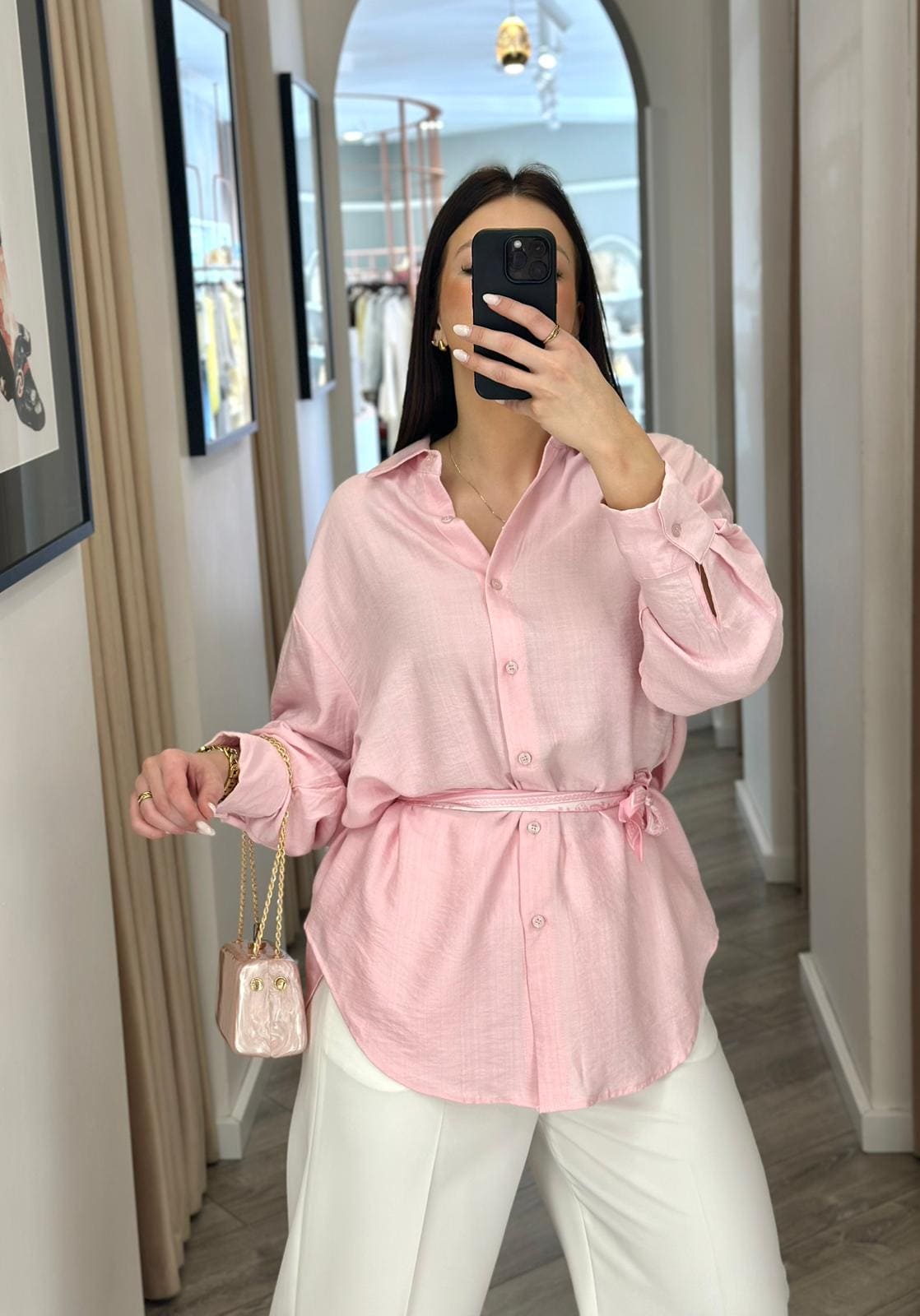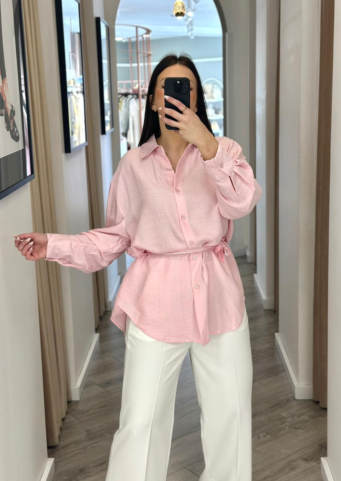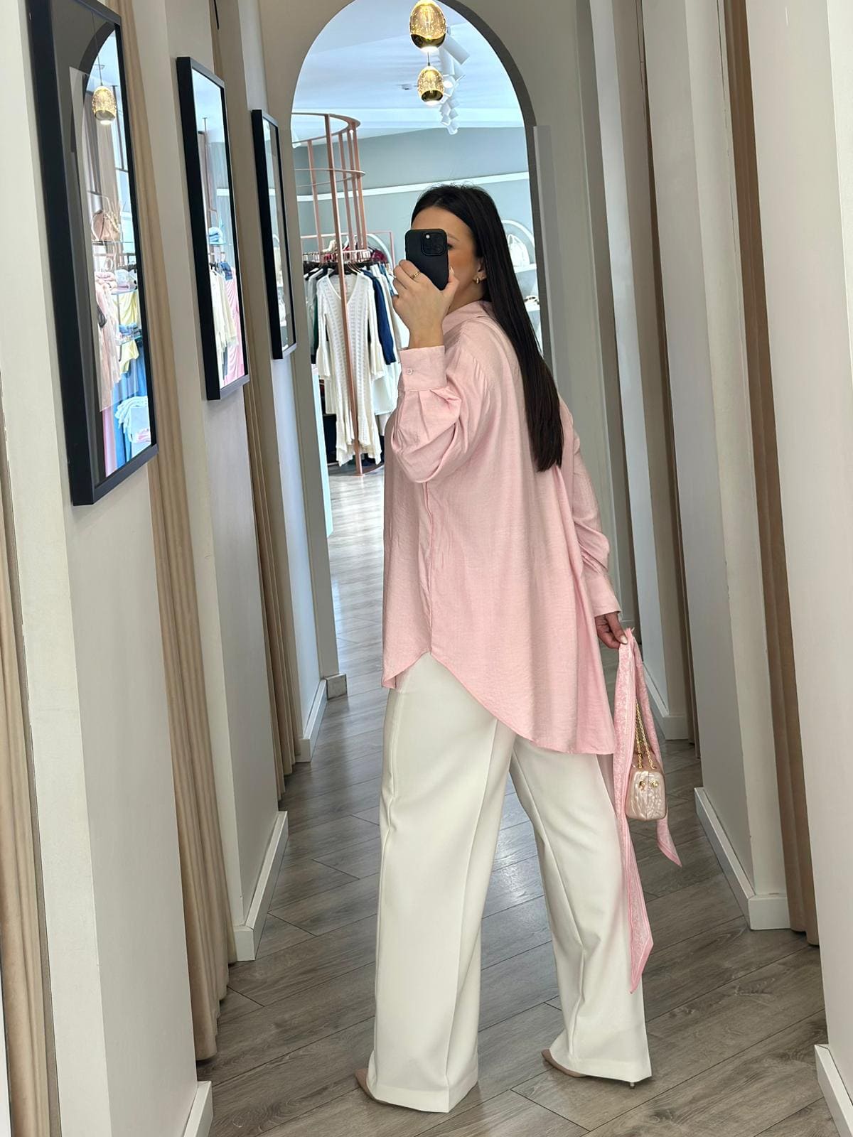Camisa em tom rosa suave, confecionada em tecido leve e fluido que confere frescura e movimento à peça. O corte amplo cria um visual descontraído e elegante, ideal para looks luminosos e sofisticados.