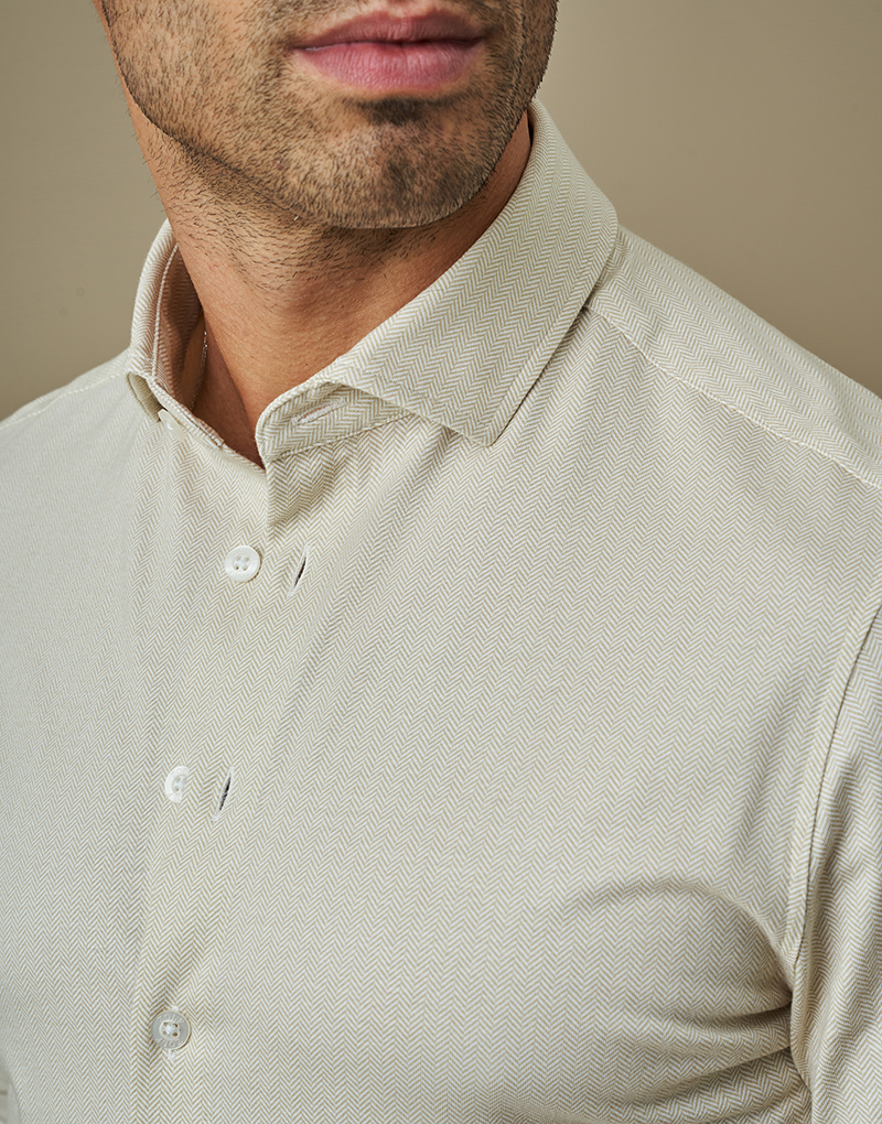 O padrão espinha em tom bege confere um visual subtilmente texturizado e sofisticado, fácil de conjugar com calças de ganga, chinos ou calças de alfaiataria. Uma camisa masculina Zolf que alia funcionalidade, estilo intemporal e um visual elegante, adequada tanto para contextos profissionais como para momentos mais descontraídos.