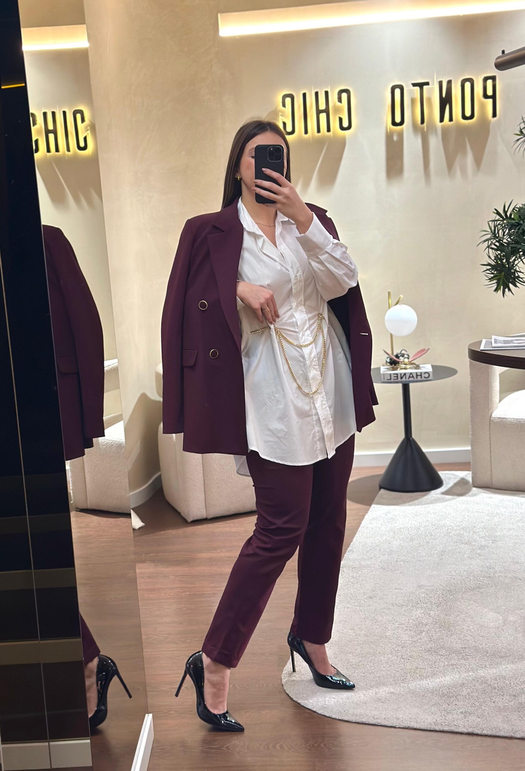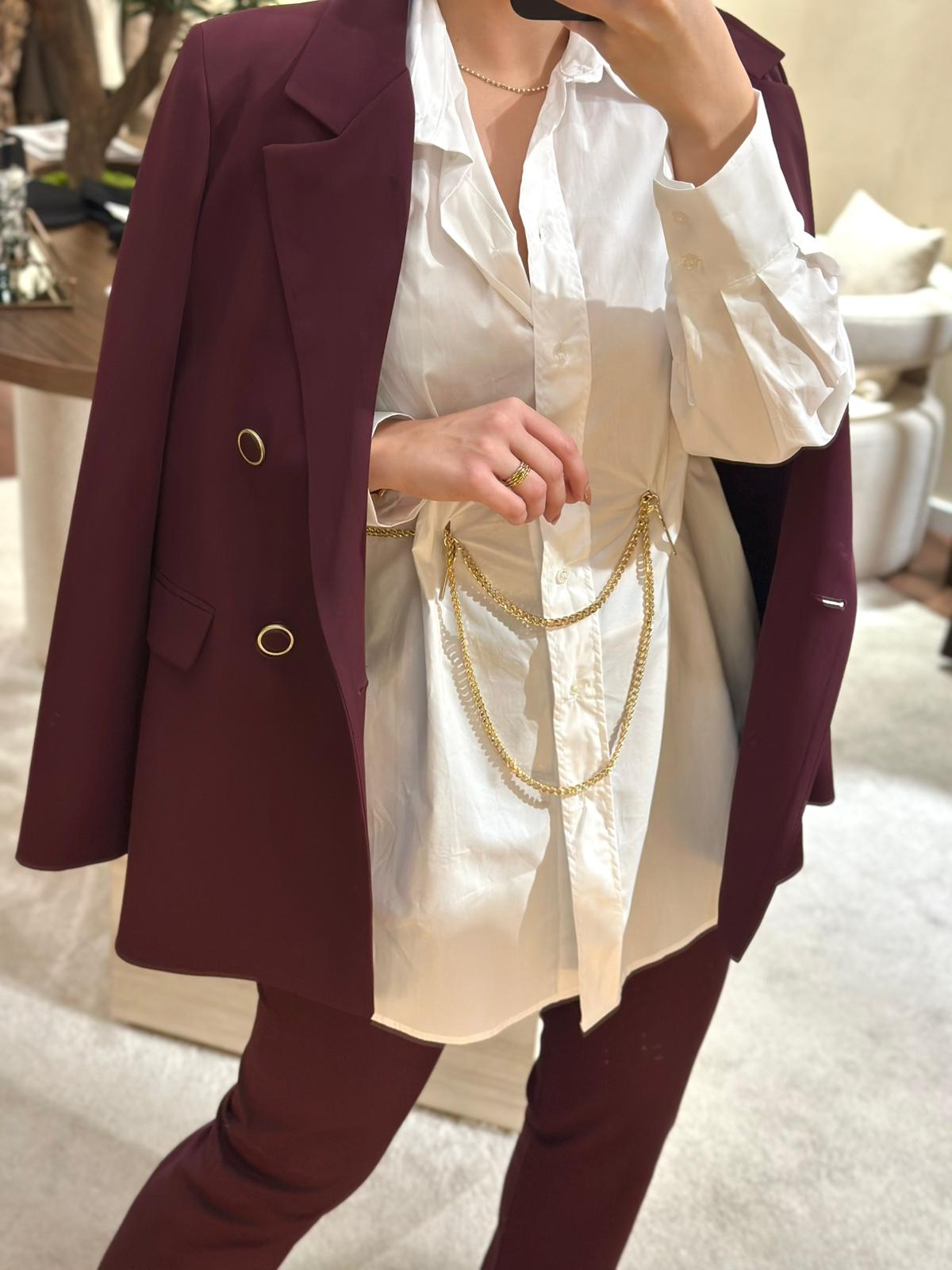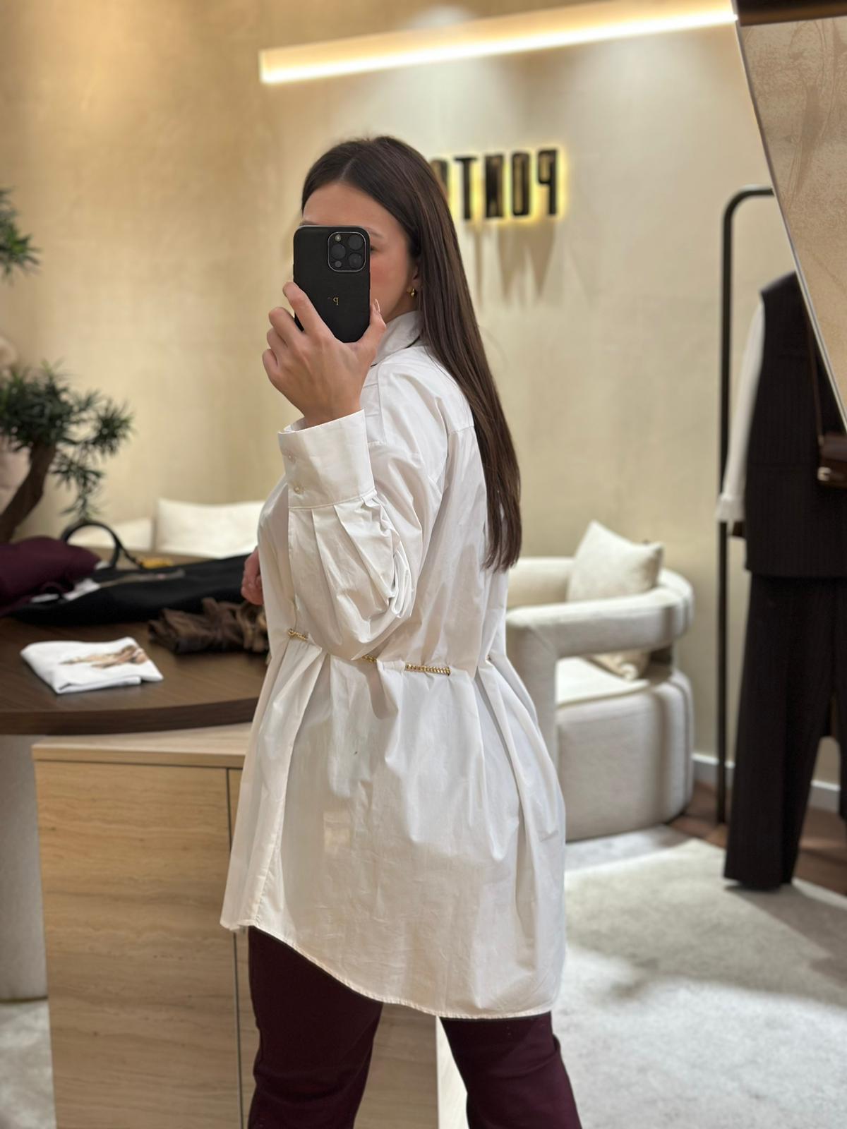 O design apresenta colarinho largo e punhos marcados, realçando o estilo camisa tradicional, enquanto a cintura franzida com correntes douradas aplicadas acrescenta um toque de glamour e transforma a silhueta, criando uma forma ligeiramente ajustada e elegante.