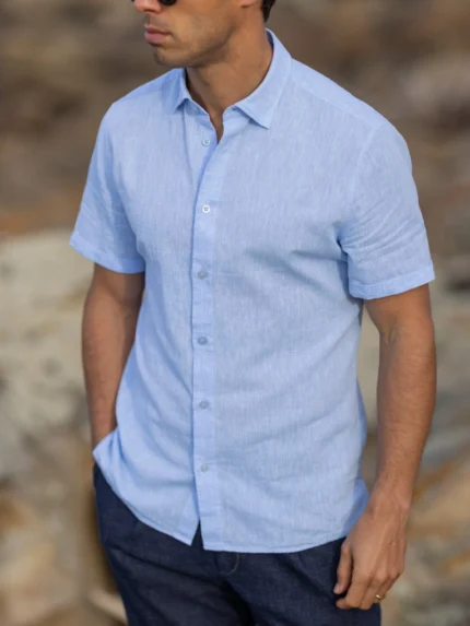 CAMISA DE LINHO MANGA CURTA GOLA ITALIANA AZUL CLARO ZOLF