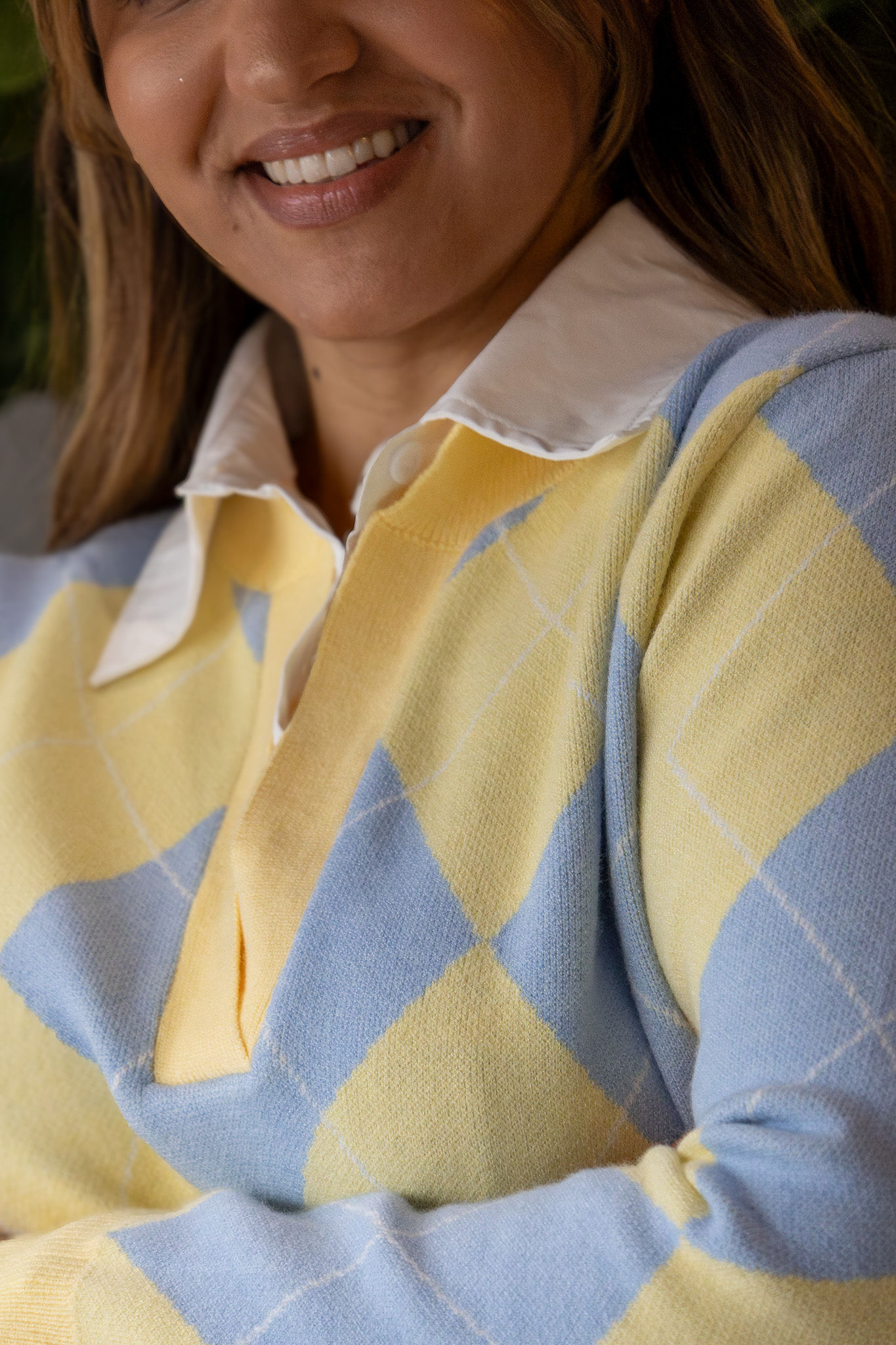 CAMISOLA AMARELA E AZUL COM PADRÃO LOSANGOS E GOLA CAMISA PONTO CHIC
