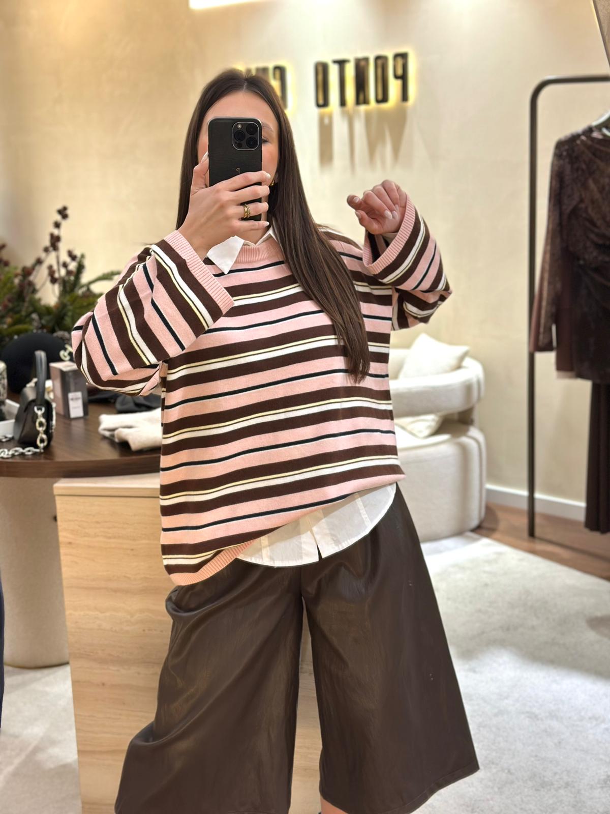 Camisola em malha suave com padrão de riscas em rosa, castanho, branco e azul-marinho, criando um visual moderno e jovem. O corte é descontraído mas elegante, perfeito para looks casuais com um toque arrumado. A gola redonda e os punhos canelados garantem conforto e um caimento impecável ao longo do dia.