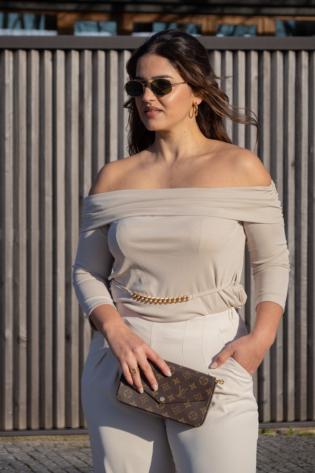O corte ajusta-se delicadamente ao corpo, valorizado pelo detalhe lateral com amarração que permite definir a silhueta de forma subtil e elegante. A aplicação de corrente dourada acrescenta um toque contemporâneo e diferenciador, tornando a peça ainda mais especial.