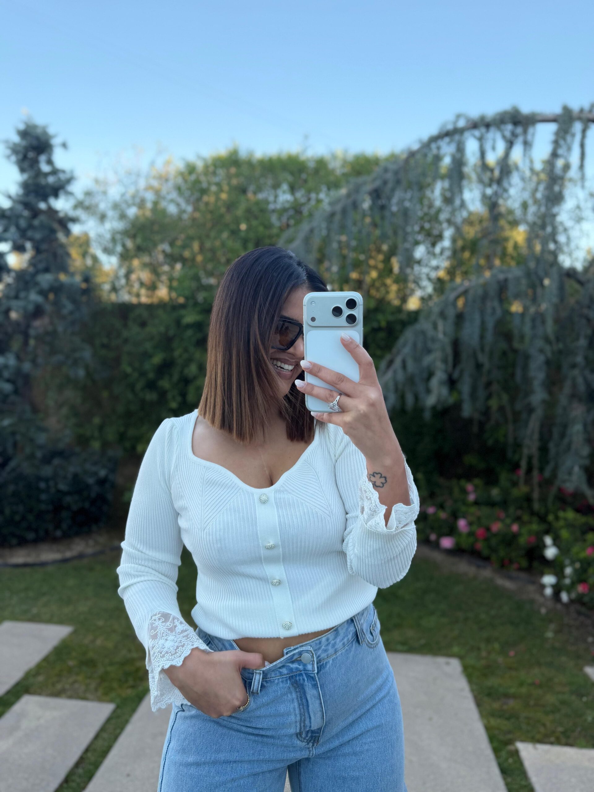 Esta camisola branca destaca-se pela sua elegância delicada e pelos detalhes românticos que elevam a peça a um nível sofisticado. Confeccionada em malha canelada suave, proporciona conforto e um ajuste harmonioso ao corpo, valorizando a silhueta de forma subtil.