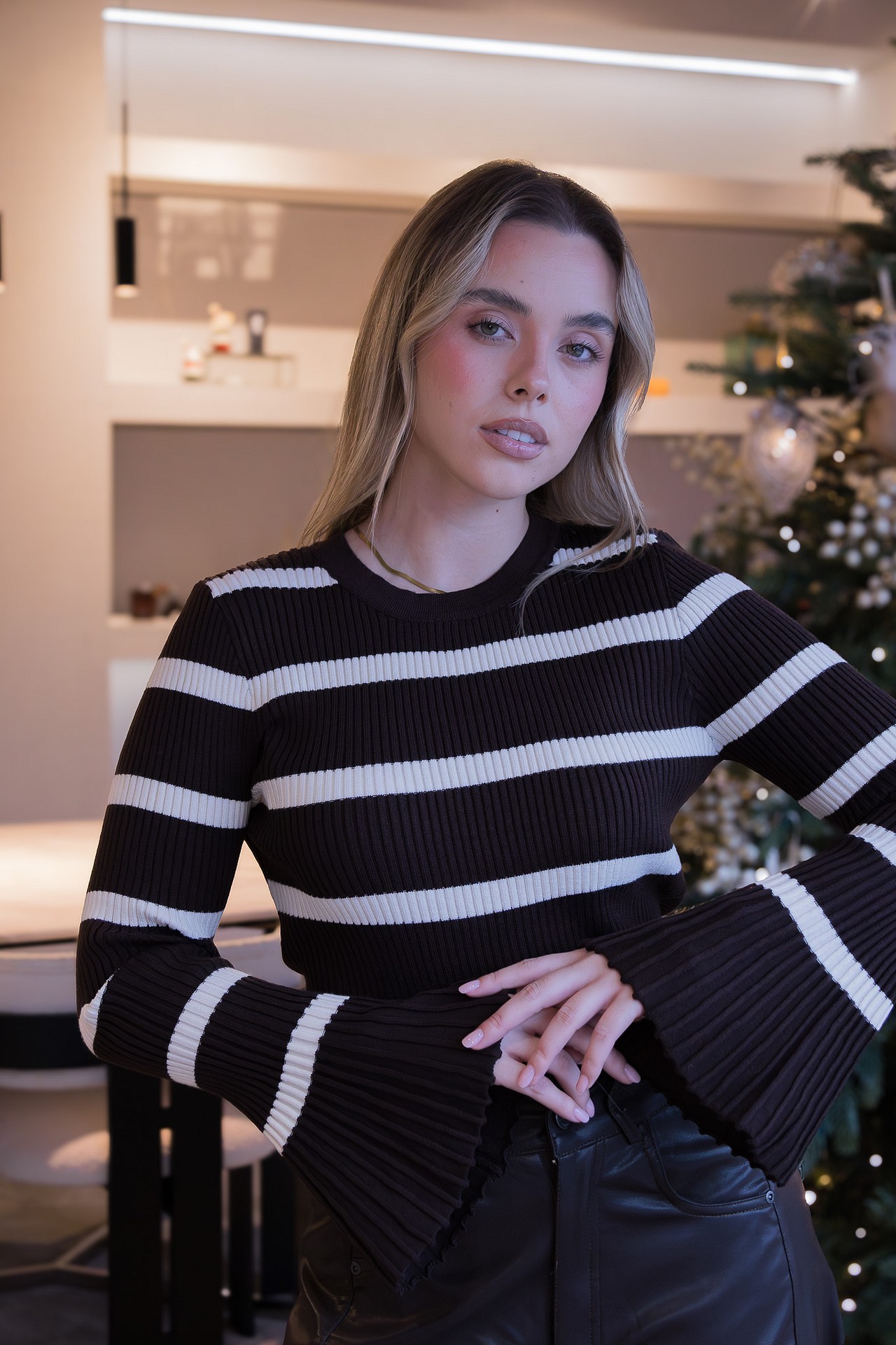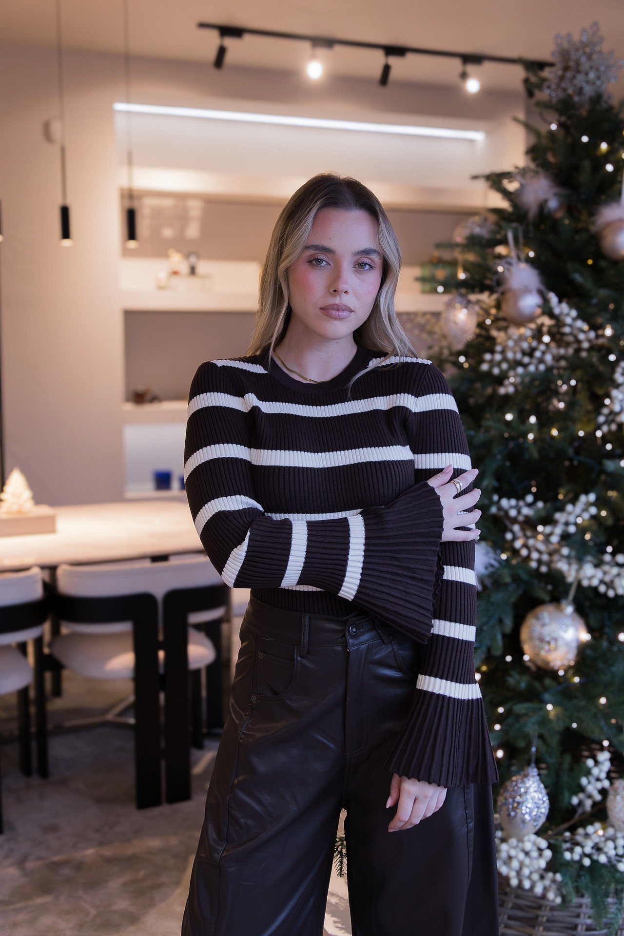 O design destaca-se pelas riscas largas em contraste e pelas mangas flare plissadas, que conferem movimento, leveza e um toque moderno e feminino. A gola redonda e a estrutura canelada reforçam o fitting elegante e atual, tornando a peça perfeita para coordenados do dia a dia com um toque sofisticado.