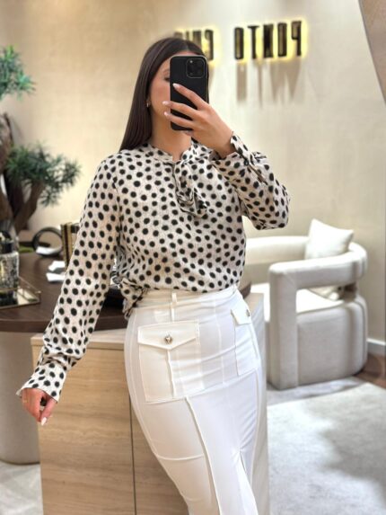 Camisola de malha canelada. Gola alta e strass brilhantes na frente. Composição: 50% Viscose 30% Poliamida 20% Poliéster