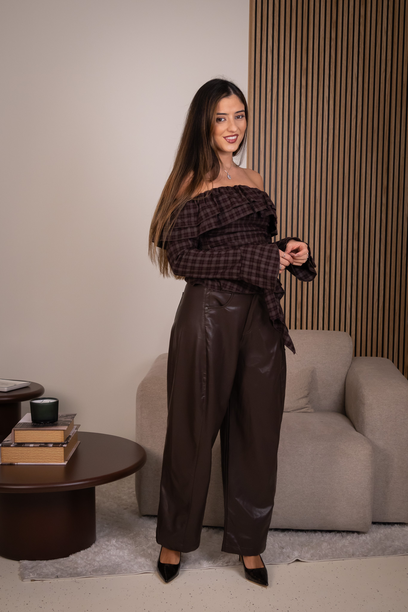 O padrão xadrez em tons castanhos adiciona um ar vintage e acolhedor, enquanto o corte fluido e o decote elástico permitem um ajuste confortável e feminino.