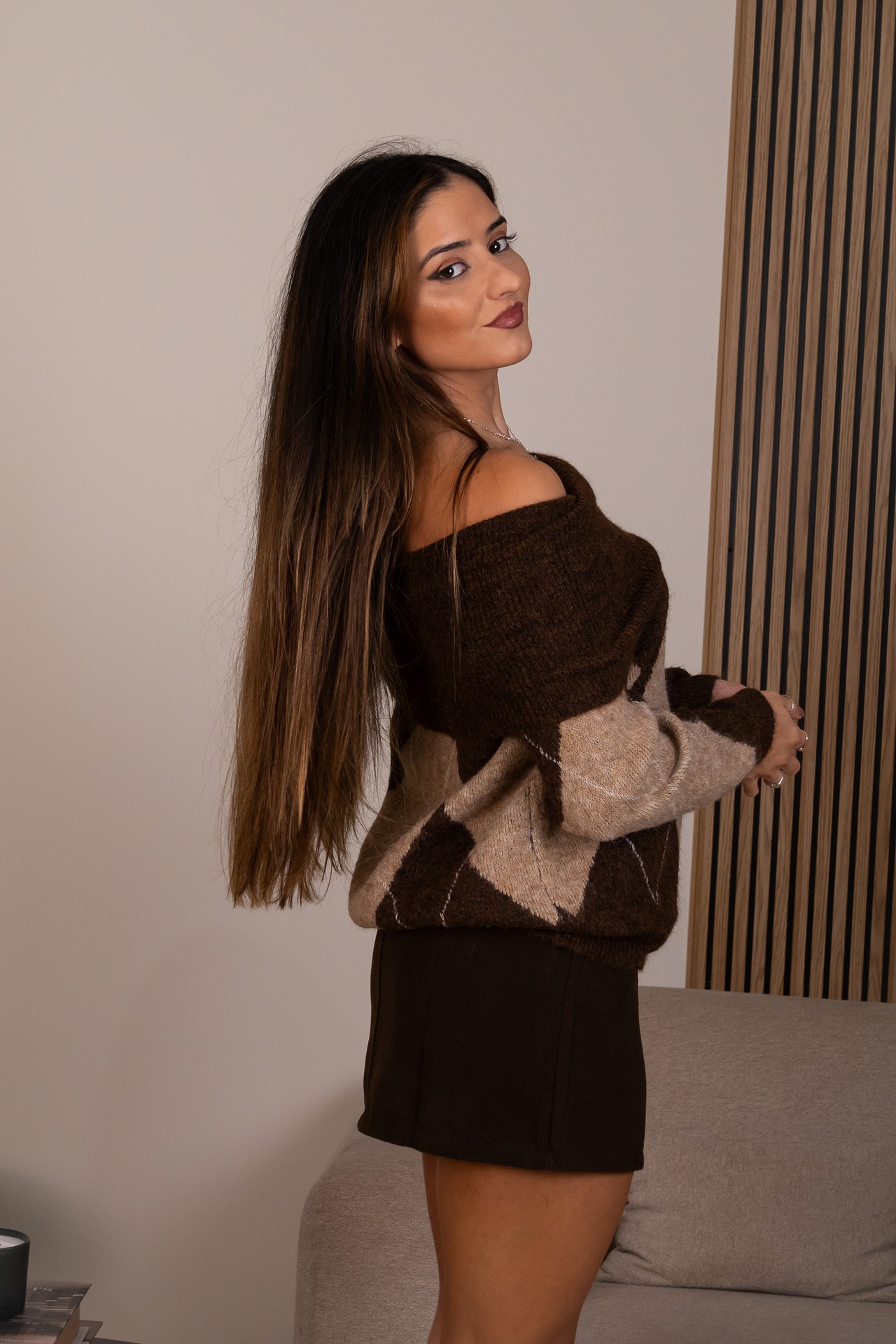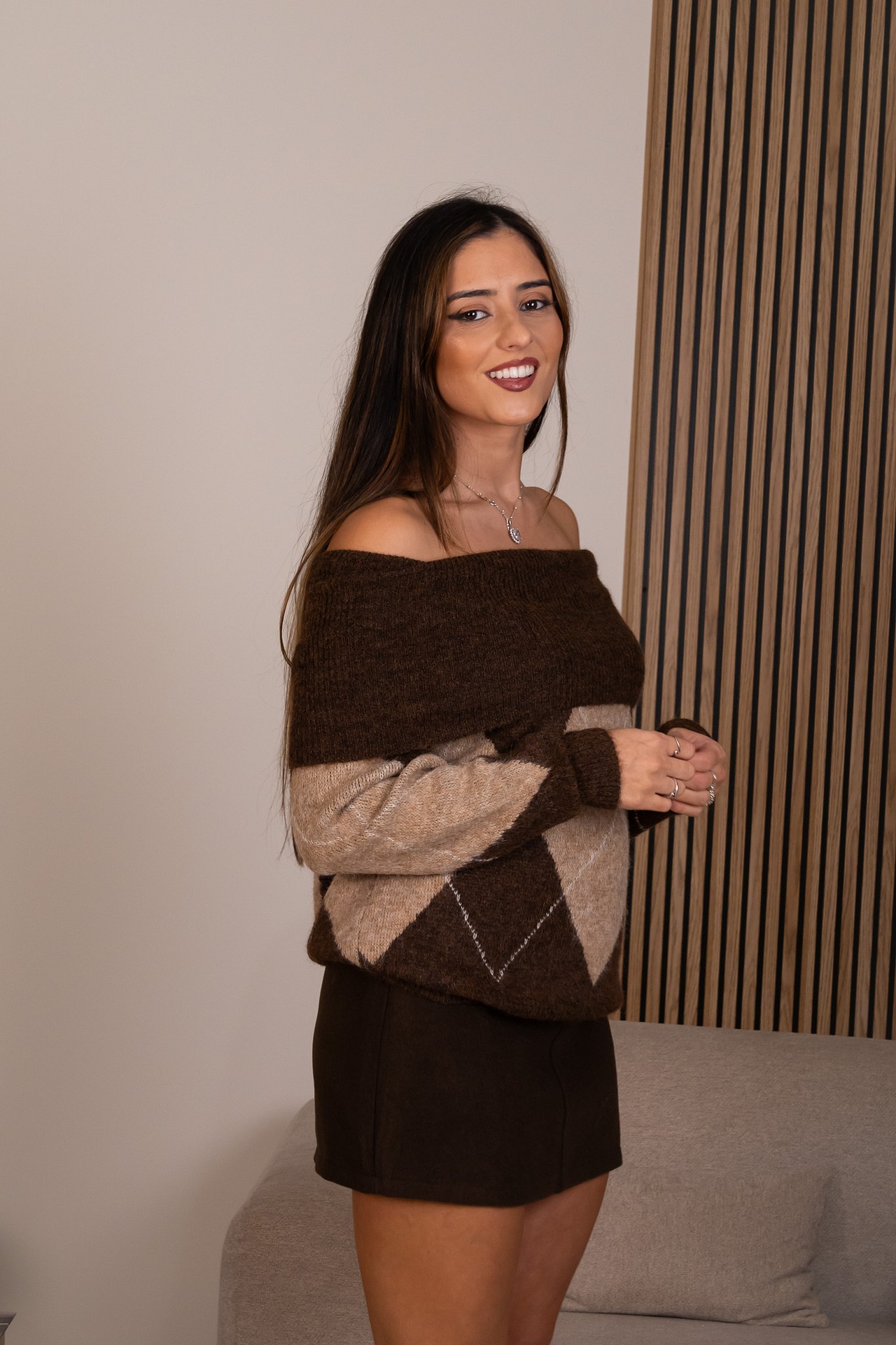 O padrão de losangos em tons de castanho e bege confere-lhe um charme retro e sofisticado, enquanto a gola alta acrescenta um toque moderno e acolhedor ao visual.
