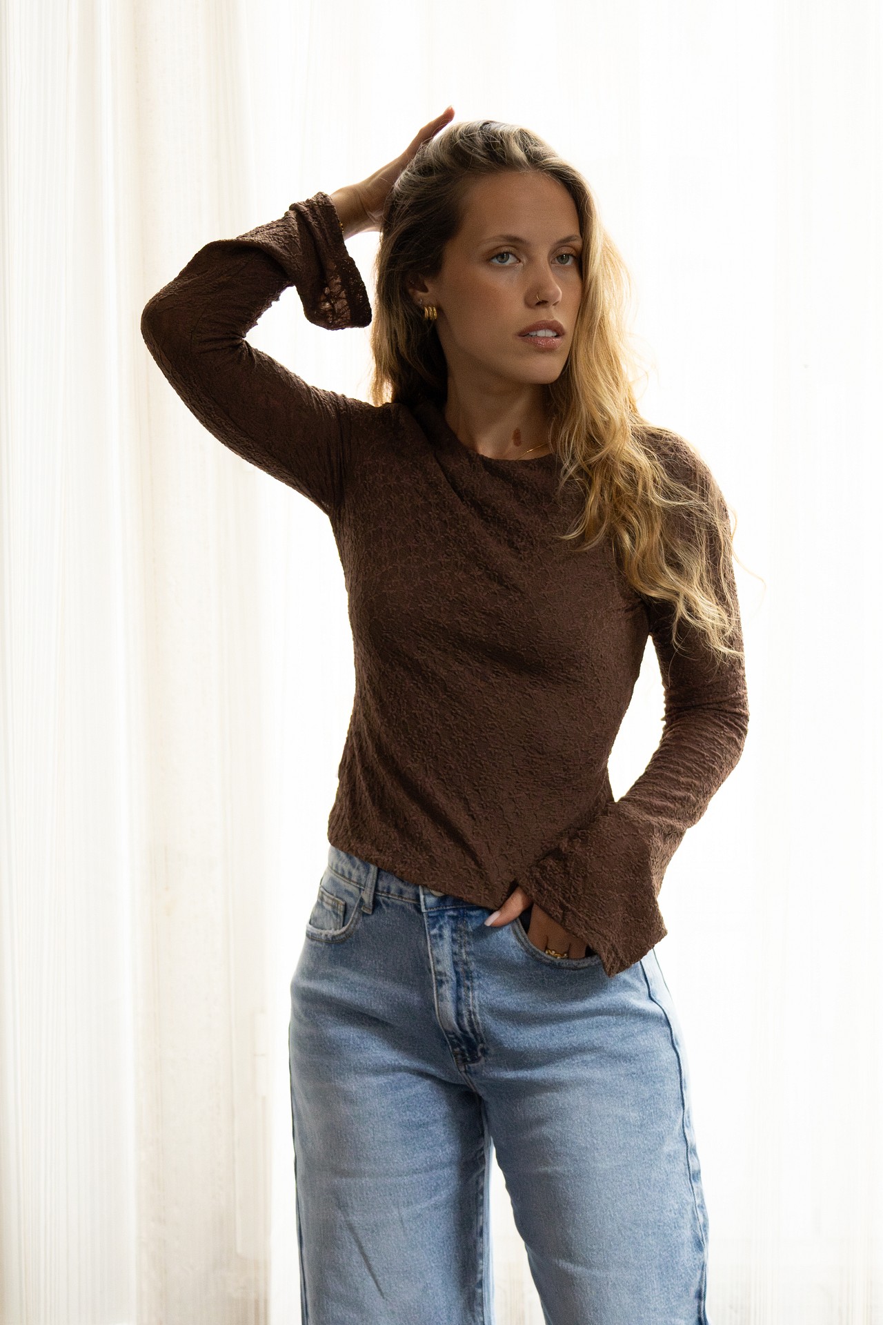 A camisola castanha de manga comprida é uma peça versátil e sofisticada, ideal para quem procura unir conforto e elegância. Confeccionada em 90% poliamida e 10% elastano, apresenta uma malha rendada delicada, de textura marcante, que confere profundidade e modernidade ao visual.