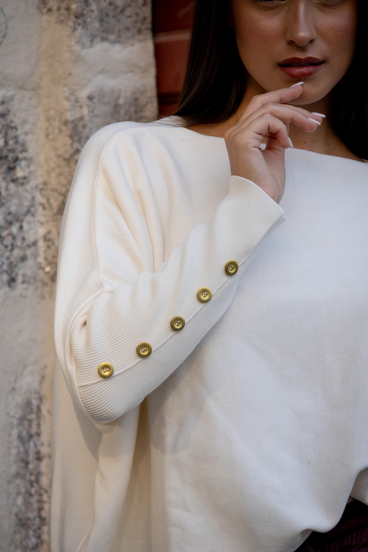 Camisola cru estilo oversized. Punho alto com aplicação de botões dourados. Decote á barco. Composição: 67% Liocel 33% Algodão