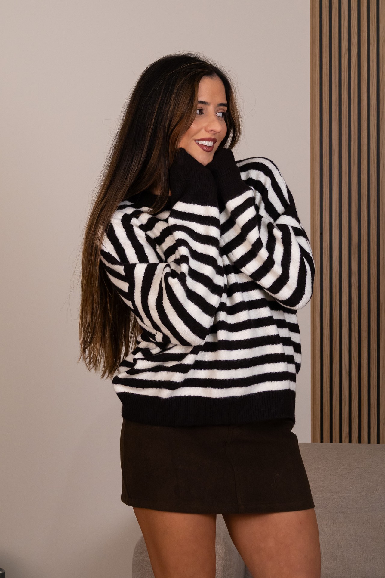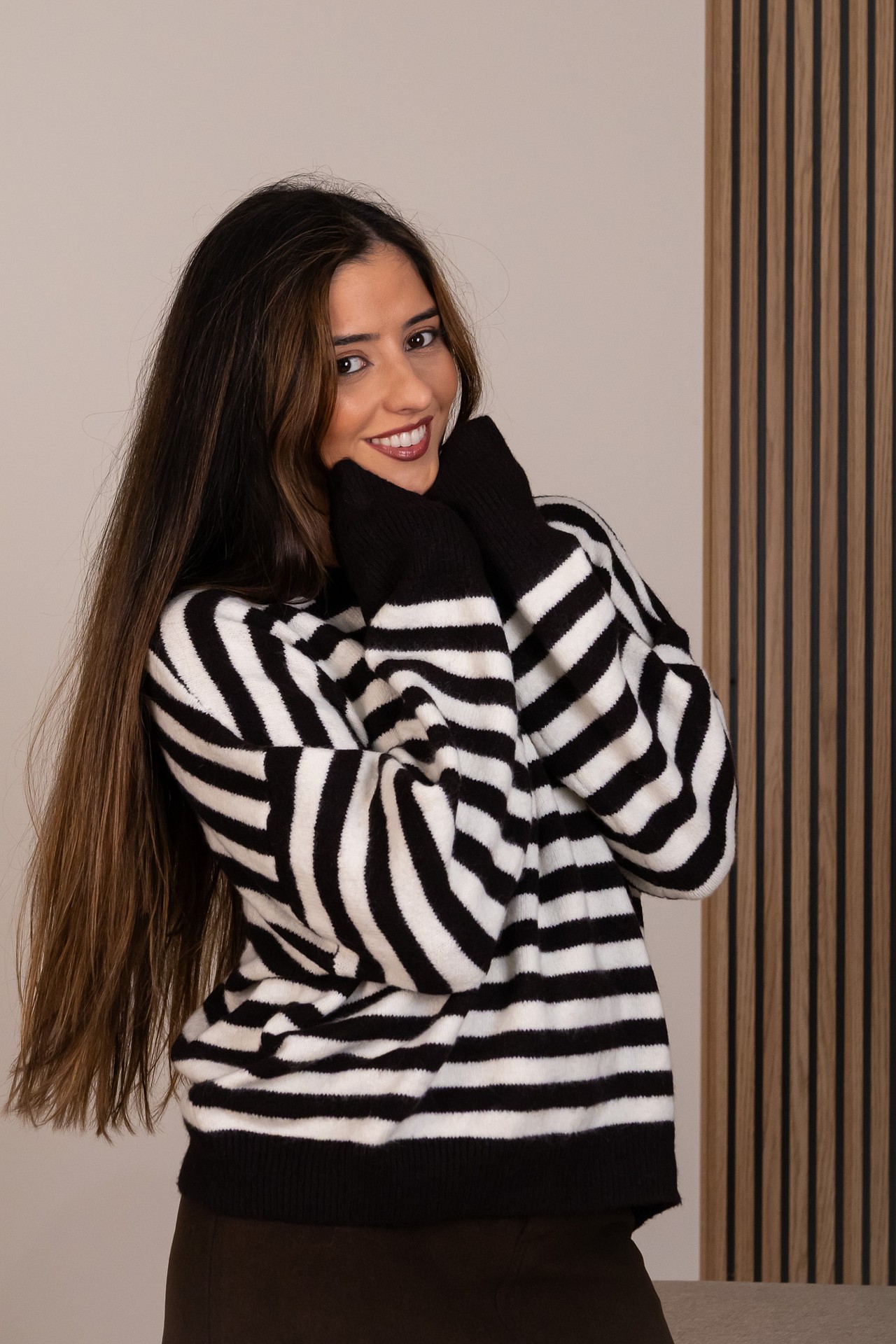 O padrão de riscas em preto e bege confere-lhe um visual clássico e sofisticado, enquanto a gola redonda e os acabamentos canelados nos punhos e na bainha acrescentam estrutura e um toque descontraído.