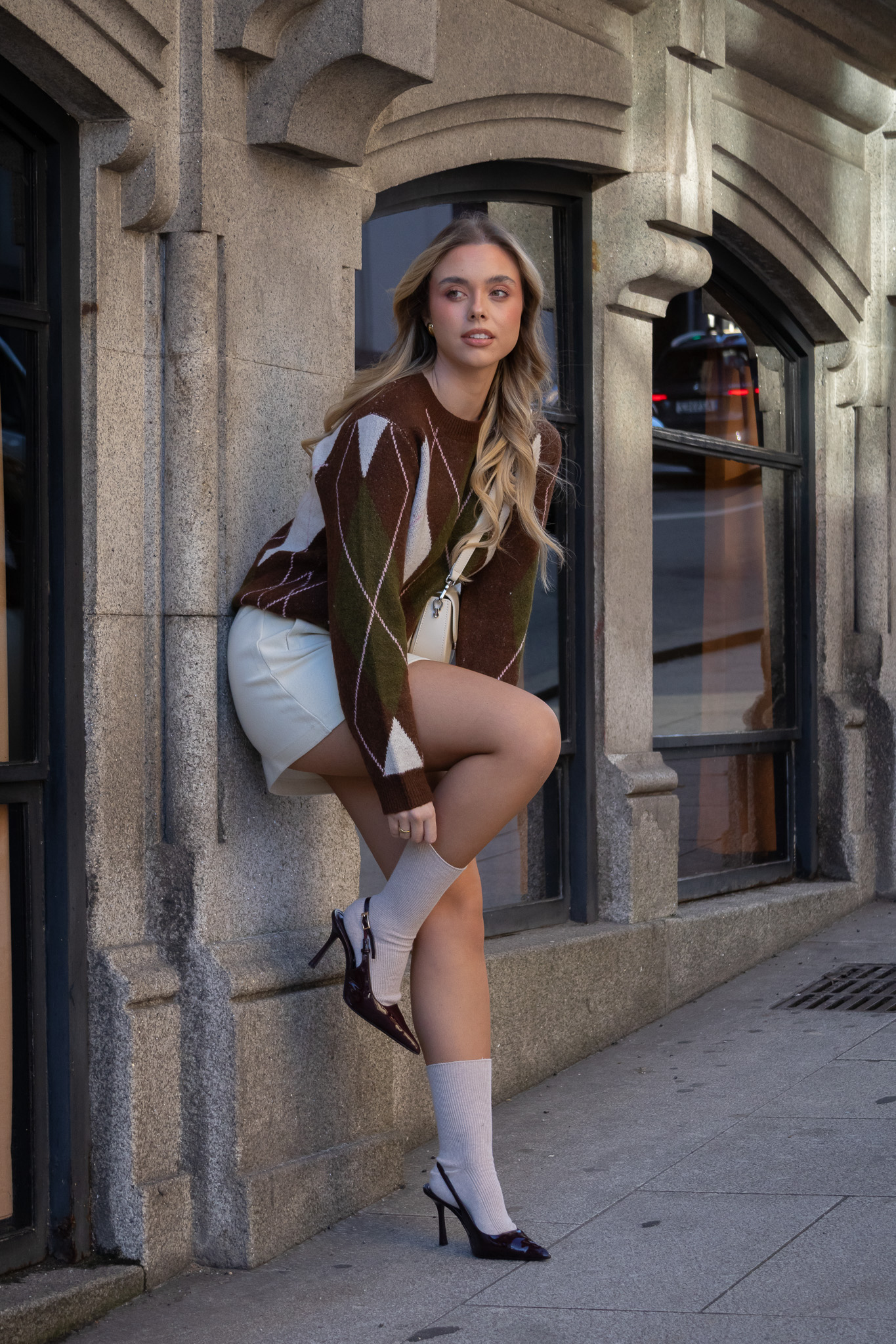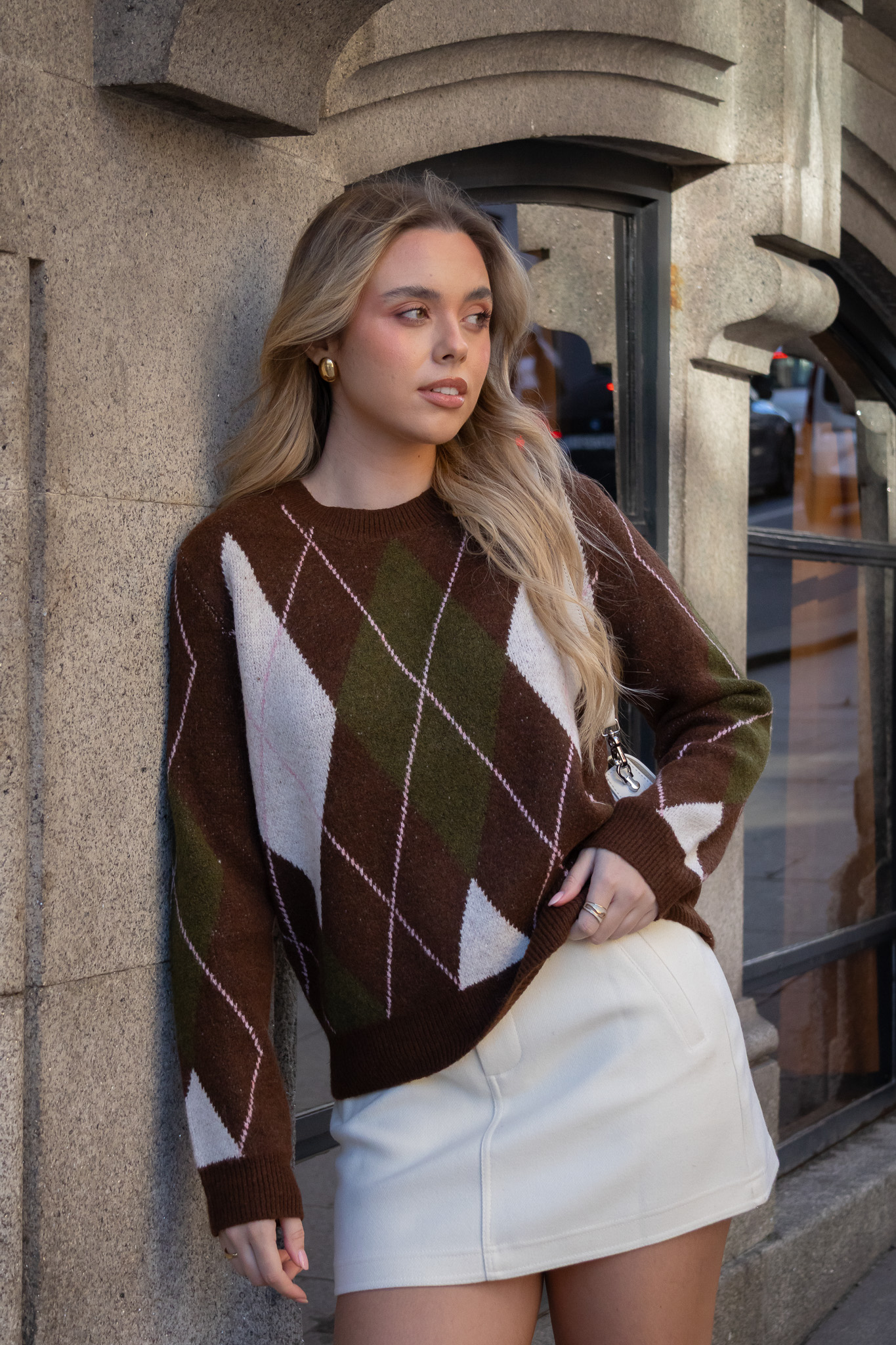 CAMISOLA DE MALHA CASTANHA COM PADRÃO LOSANGOS PONTO CHIC