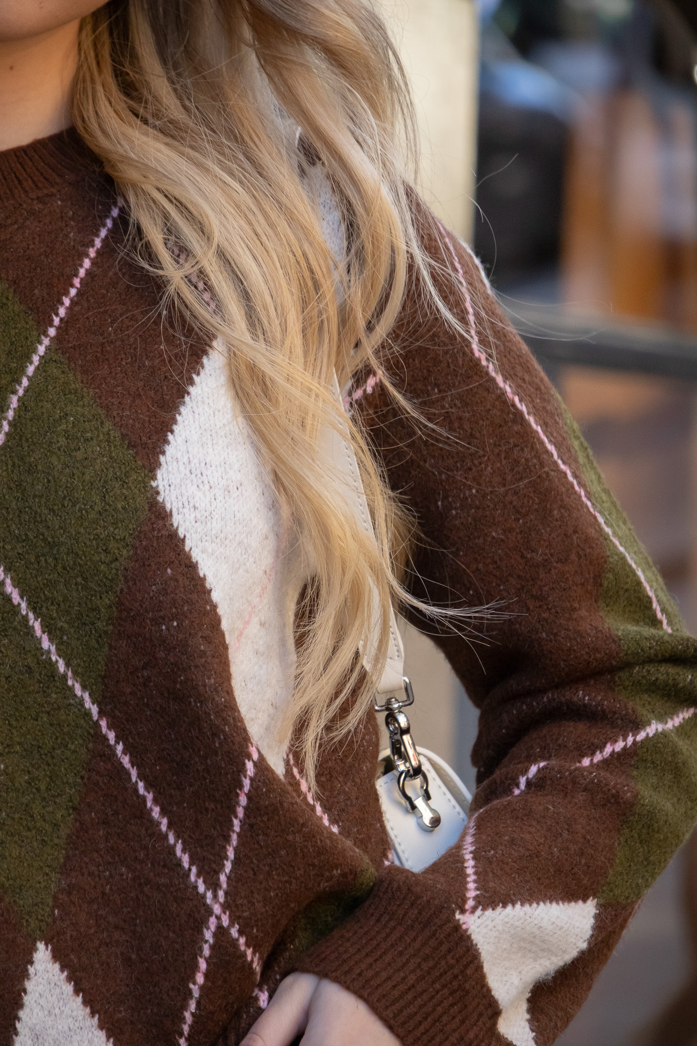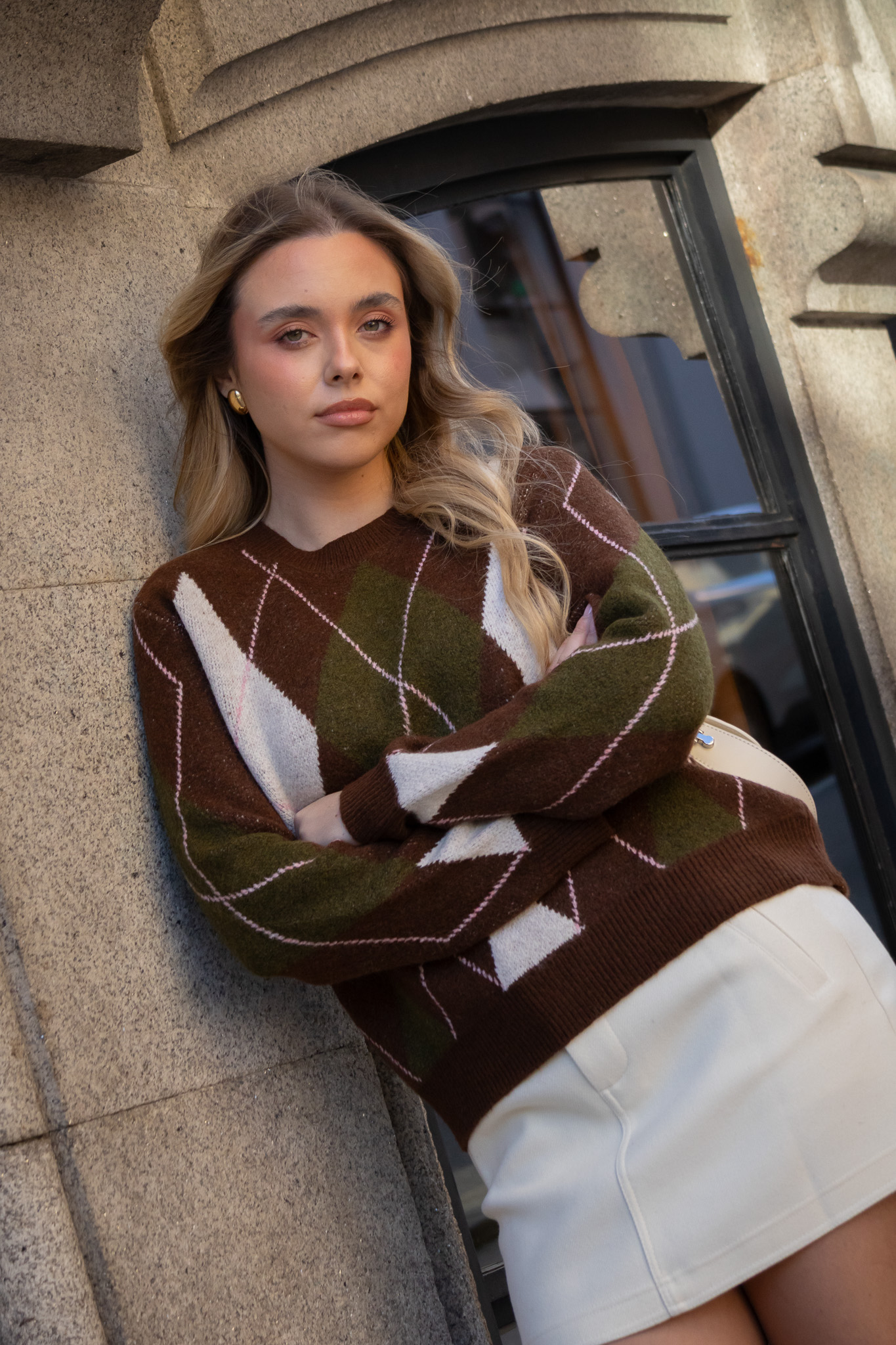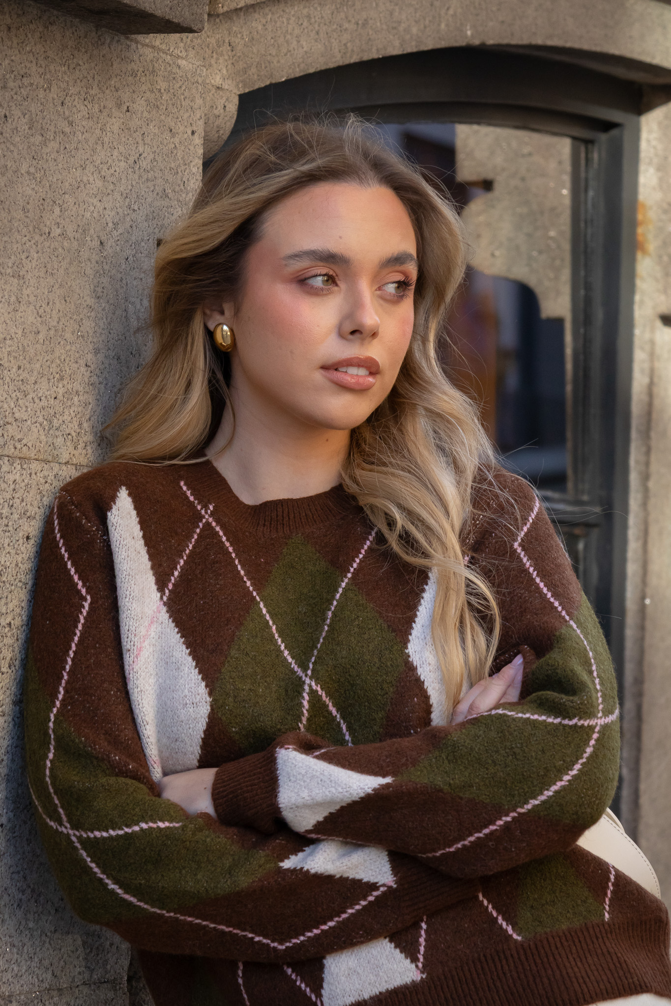 O destaque da peça é o padrão de losangos em intársia de malha, trabalhado em tons de castanho, verde e cru, com linhas finas em rosa que acrescentam contraste e sofisticação visual. O decote redondo e os acabamentos canelados proporcionam estrutura e garantem um caimento confortável e cuidado.