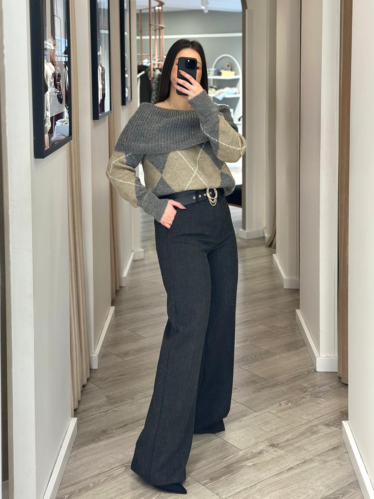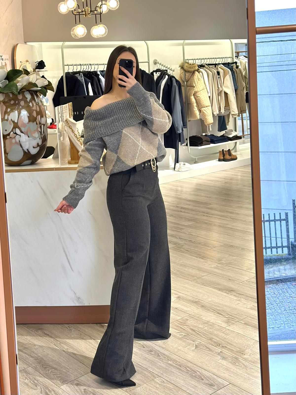 Versátil e fácil de conjugar, esta camisola de malha cinza com padrao losangos Huang’s resulta perfeitamente com calças de alfaiataria, jeans ou saias, adaptando-se tanto a looks casuais chic como a combinações mais elegantes. Uma peça essencial para um guarda-roupa de inverno sofisticado.