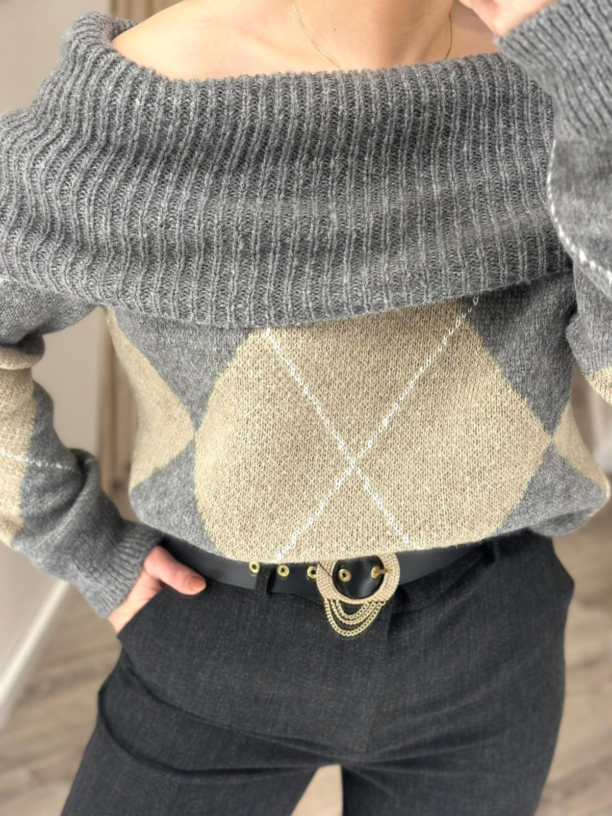 Esta camisola de malha Huang’s distingue-se pelo seu design elegante e intemporal, com padrão de losangos em tons de cinza e taupe, criando um contraste sofisticado e muito atual. Confeccionada numa mistura de 10% mohair, 20% nylon e 70% acrilico, oferece um toque macio, quente e confortável, ideal para os dias mais frios.