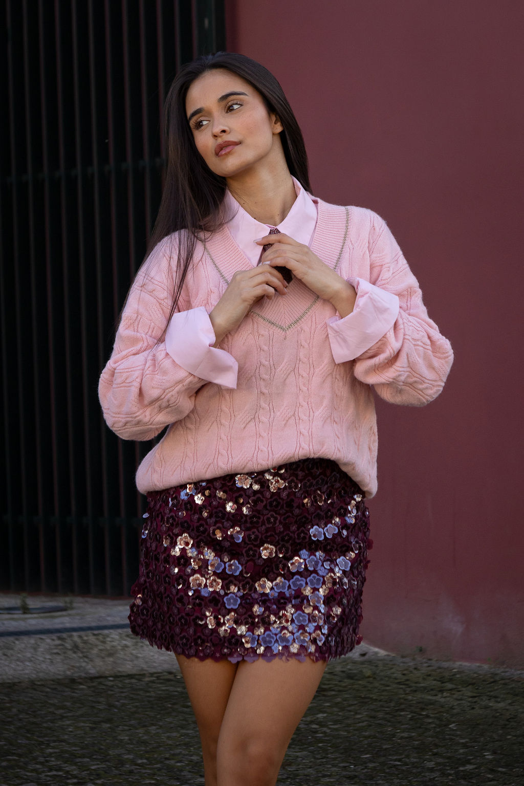 Versátil e fácil de conjugar, esta camisola de malha rosa adapta-se tanto a looks mais clássicos com calças de alfaiataria como a combinações mais descontraídas com denim. Uma peça feminina e intemporal, pensada para um guarda-roupa elegante, com a assinatura da Ponto Chic.