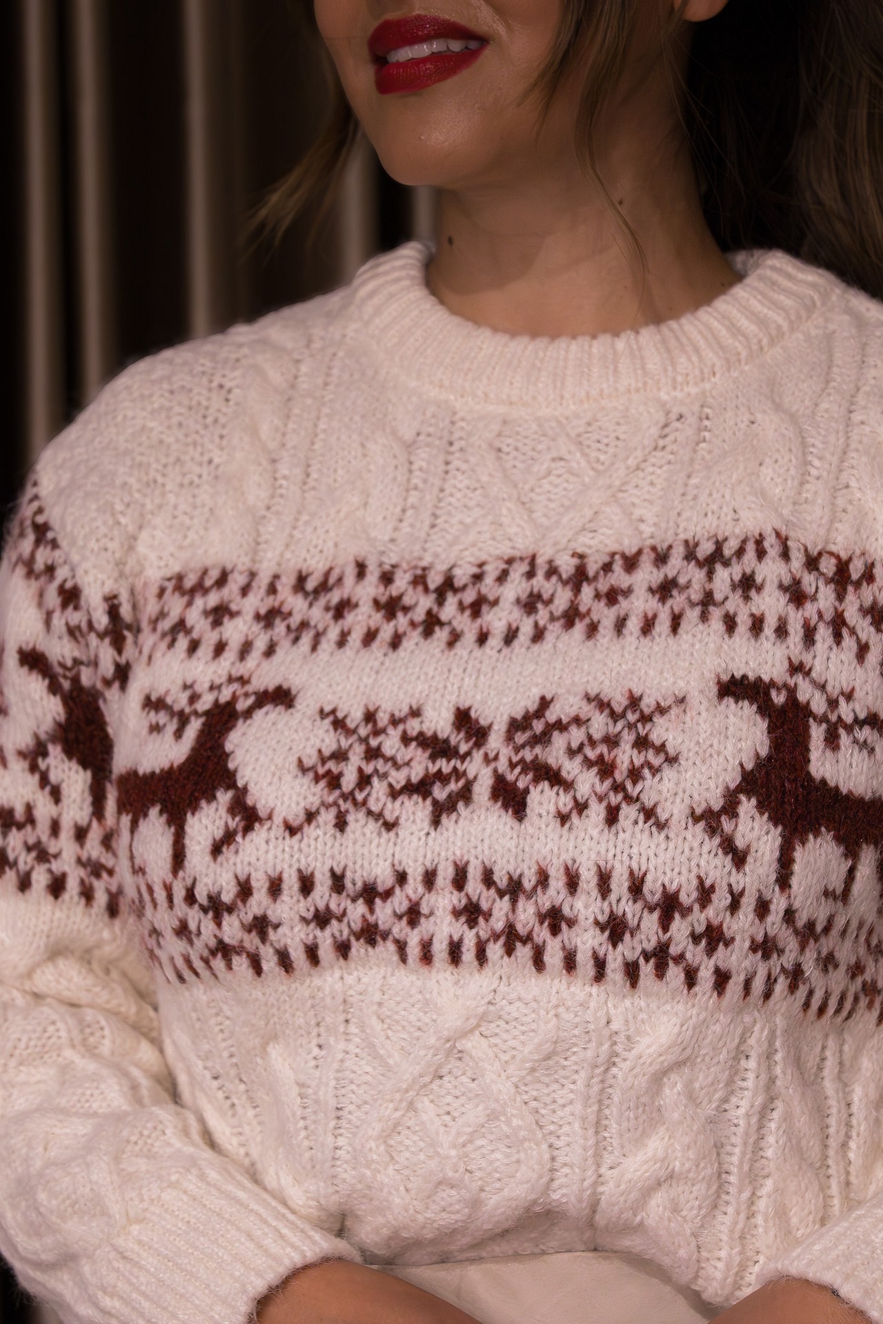 Com um visual inspirado nos clássicos nórdicos, esta camisola branca com renas bordeaux chic é perfeita para usar no dia a dia, jantares de Natal, fotografias festivas ou simplesmente para entrar no espírito da estação com charme e personalidade.
