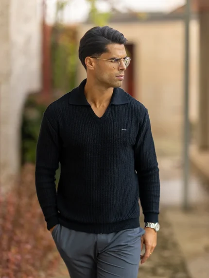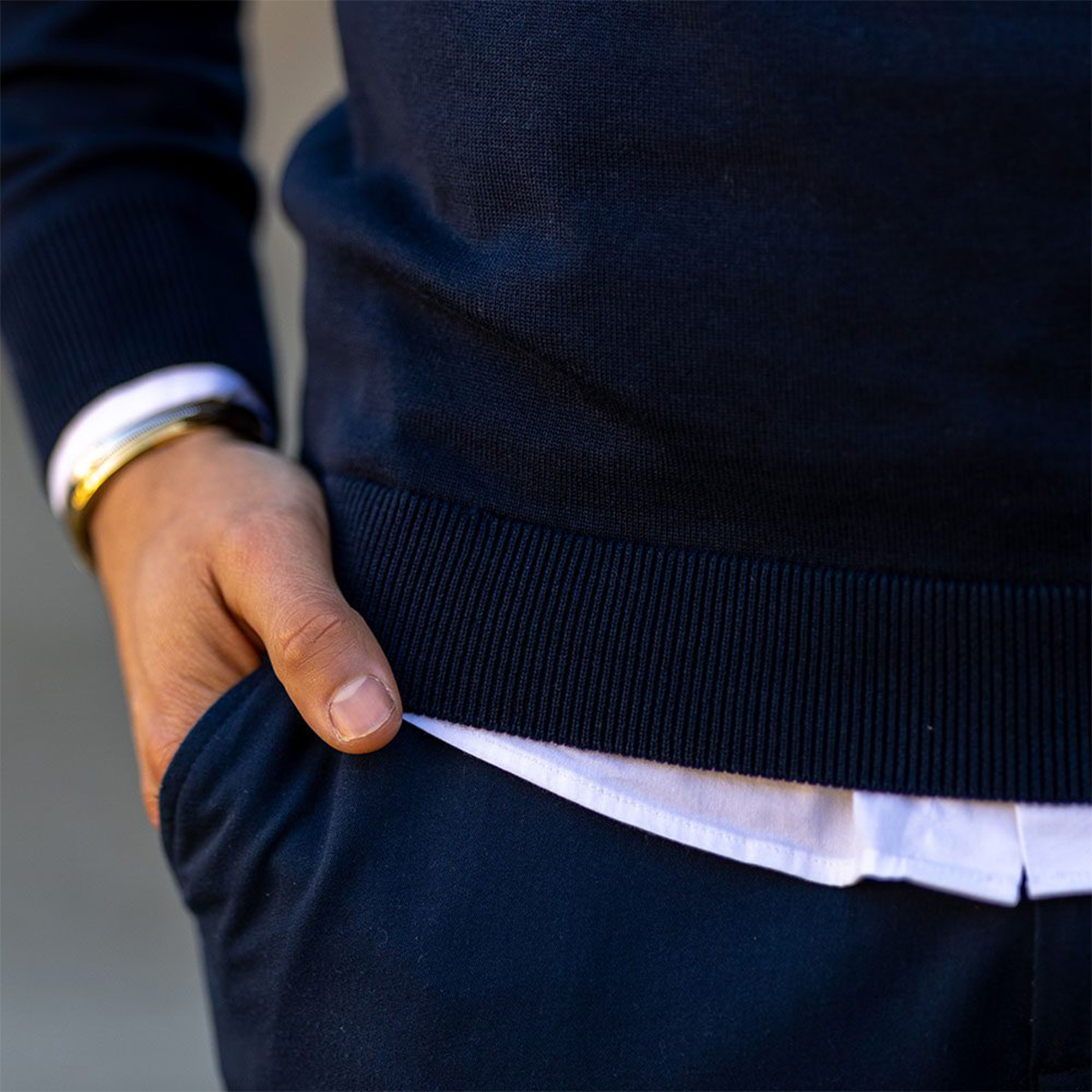 O tom azul profundo transmite sobriedade e sofisticação, ideal para conjugar com camisas brancas ou tons neutros. O corte regular e o decote em bico valorizam o visual clássico e tornam esta peça uma escolha segura para qualquer ocasião.