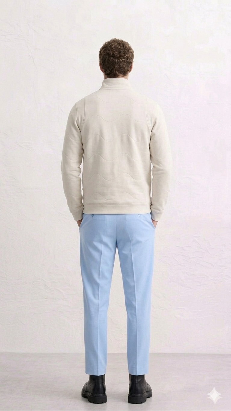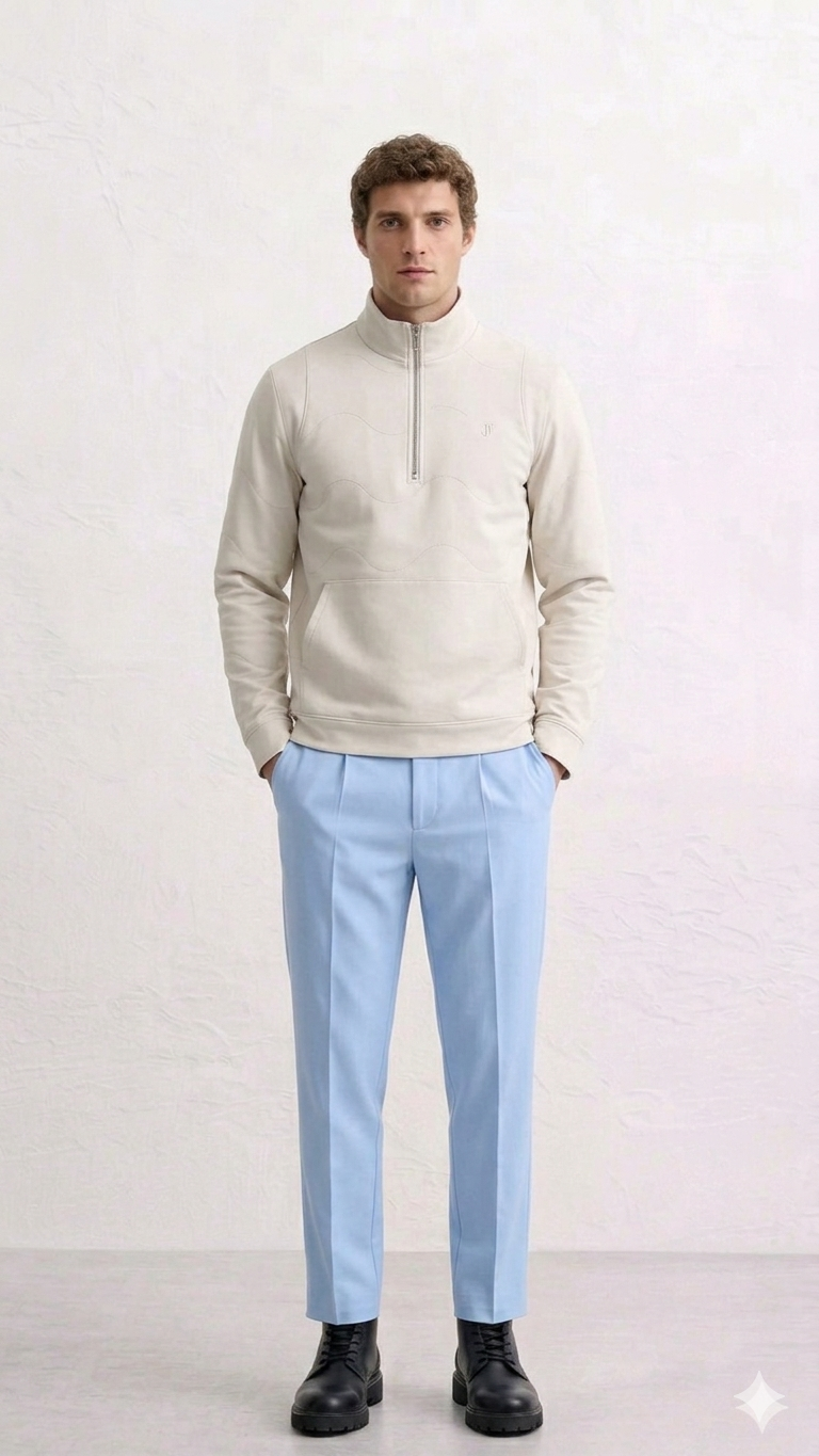 Apresenta um design contemporâneo com fecho parcial frontal e gola estruturada, conferindo um equilíbrio entre o casual e o sofisticado. Destaca-se pelos pespontos ondulados ao longo da peça, que acrescentam textura e um detalhe diferenciador. O bolso frontal tipo canguru reforça a funcionalidade, enquanto o logótipo JEF bordado no peito assegura a identidade da marca com discrição.