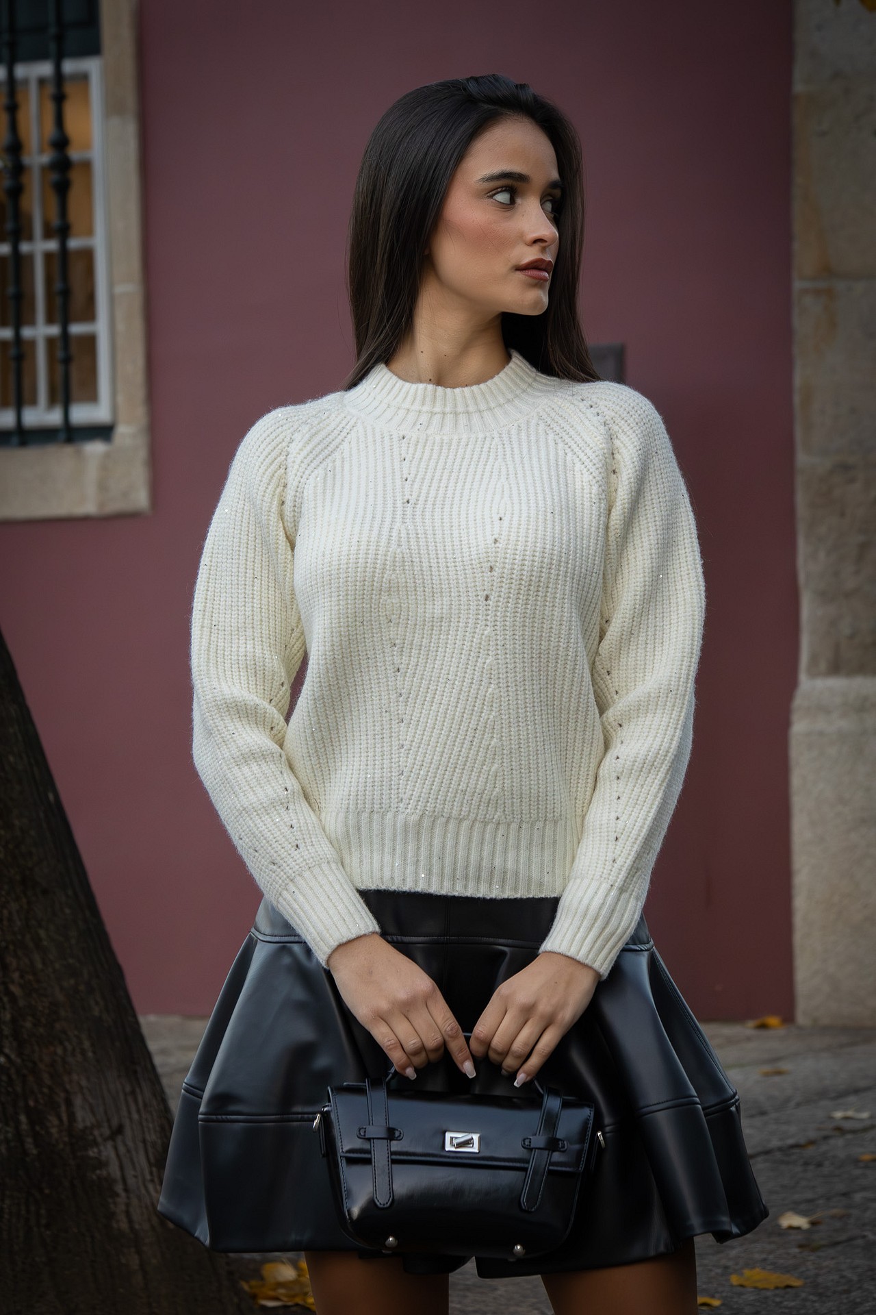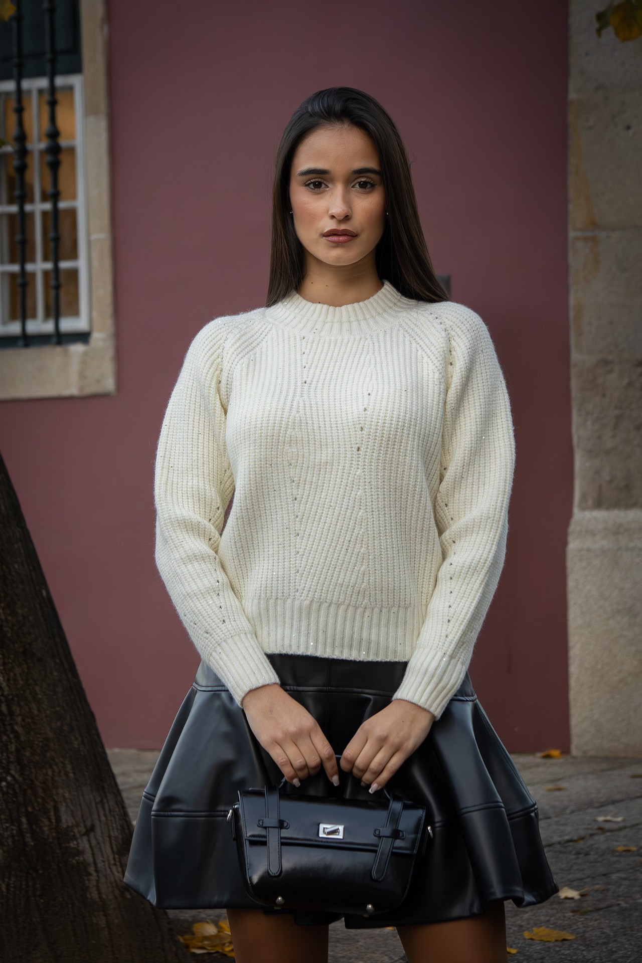 O corte solto oferece conforto e movimento, enquanto o brilho subtil do tom panna ilumina qualquer coordenado sem pesar. A gola redonda e o caimento descontraído tornam-na fácil de combinar, desde saias festivas a calças mais clássicas ou até denim para um contraste moderno.