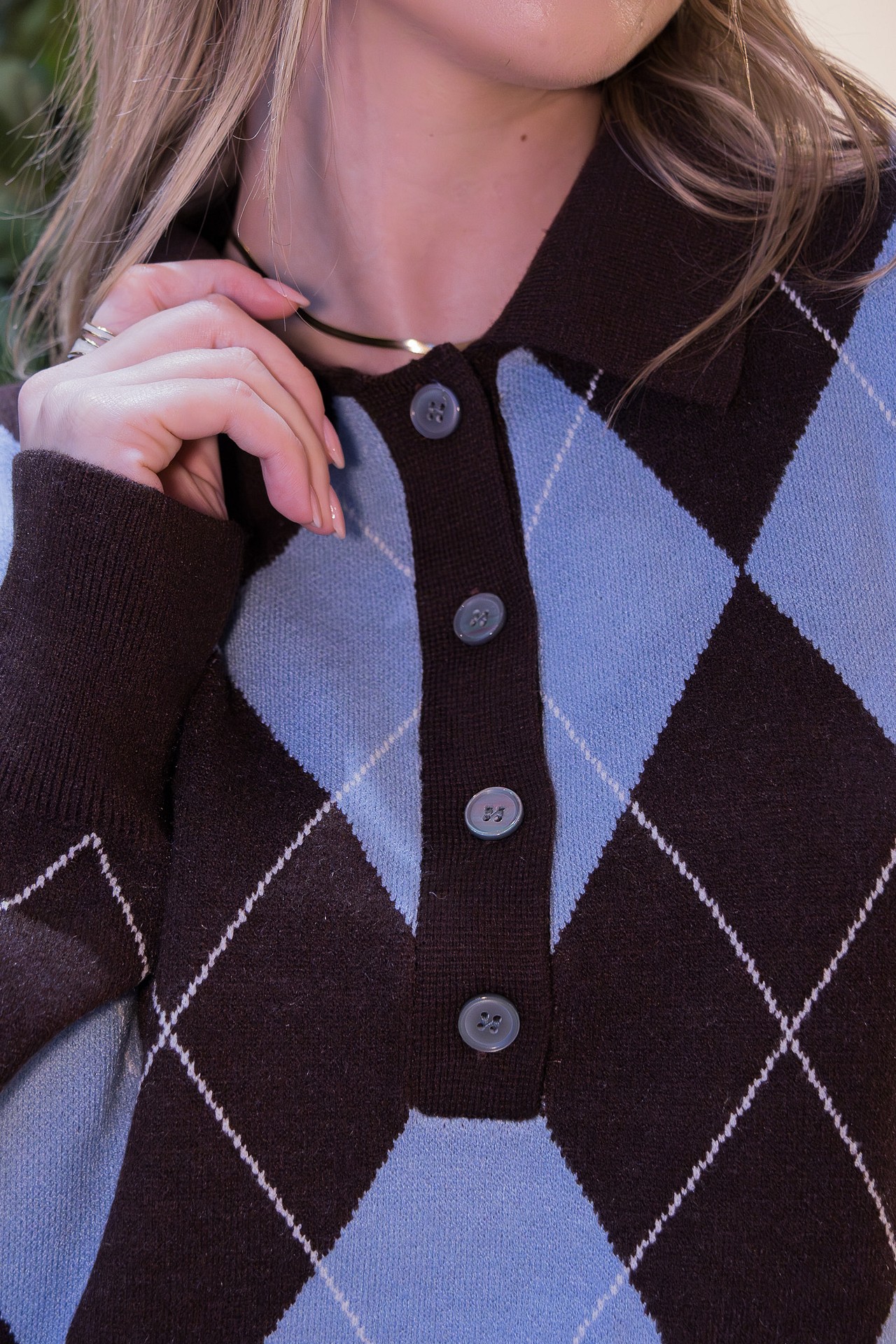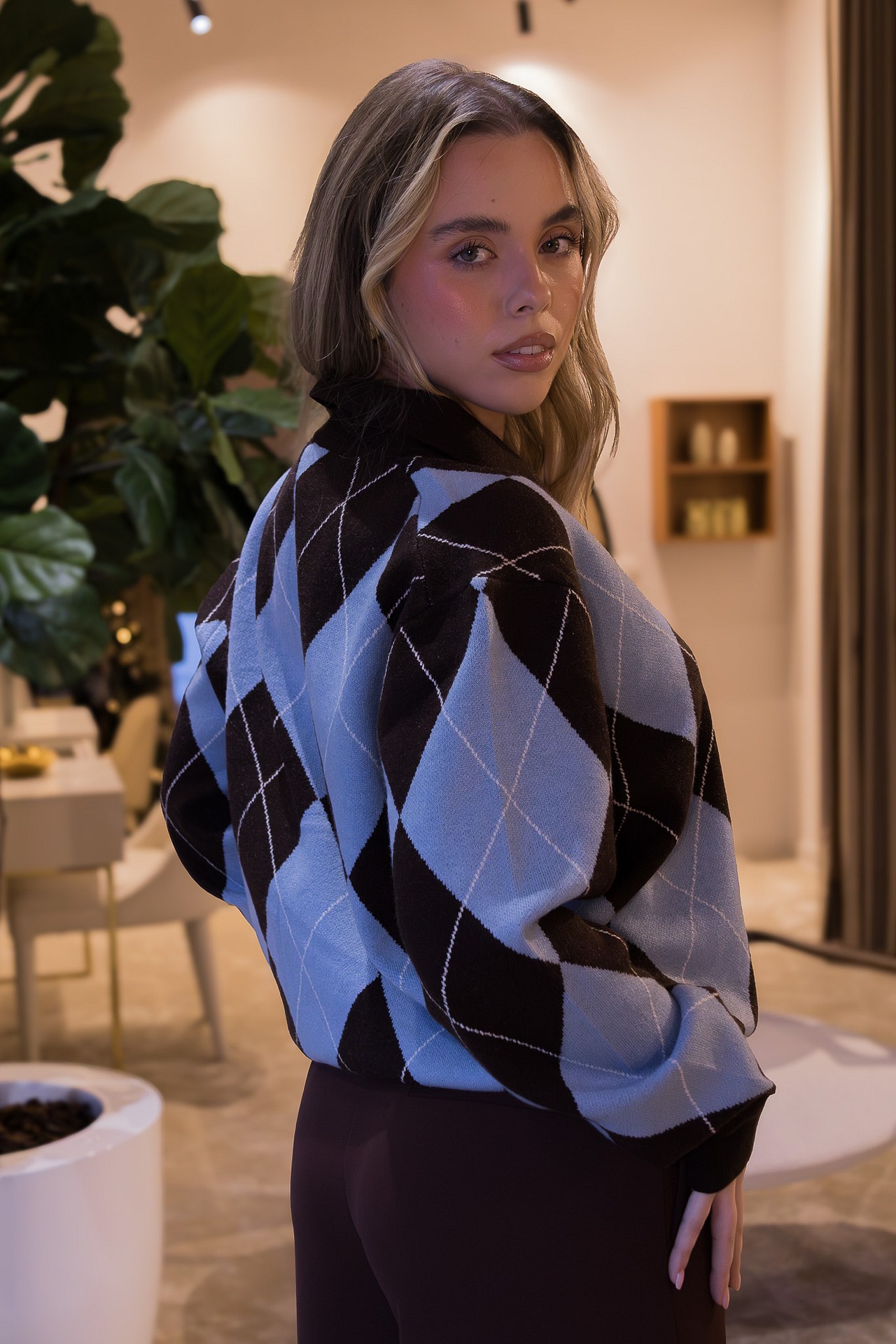 O design destaca-se pelo padrão clássico de losangos, aqui reinterpretado em tons de azul e castanho, criando um contraste moderno e elegante. A gola subida com abertura em botões permite ajustar o decote conforme o estilo pretendido, enquanto os punhos e a bainha canelados reforçam a estrutura da camisola e asseguram um caimento sempre impecável.