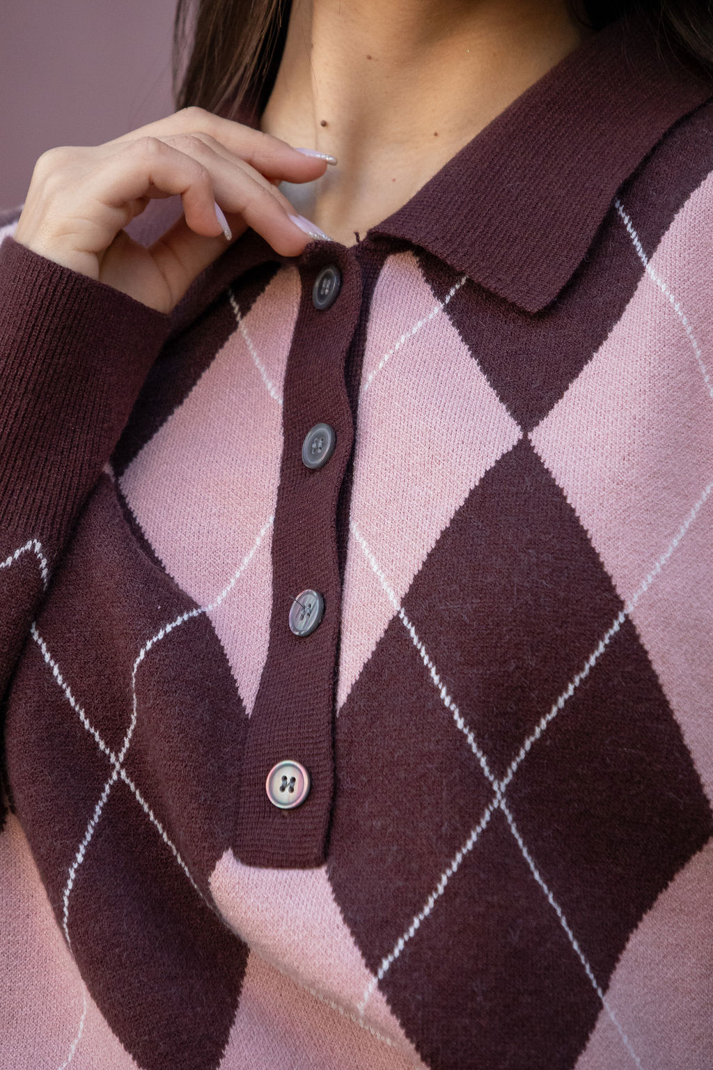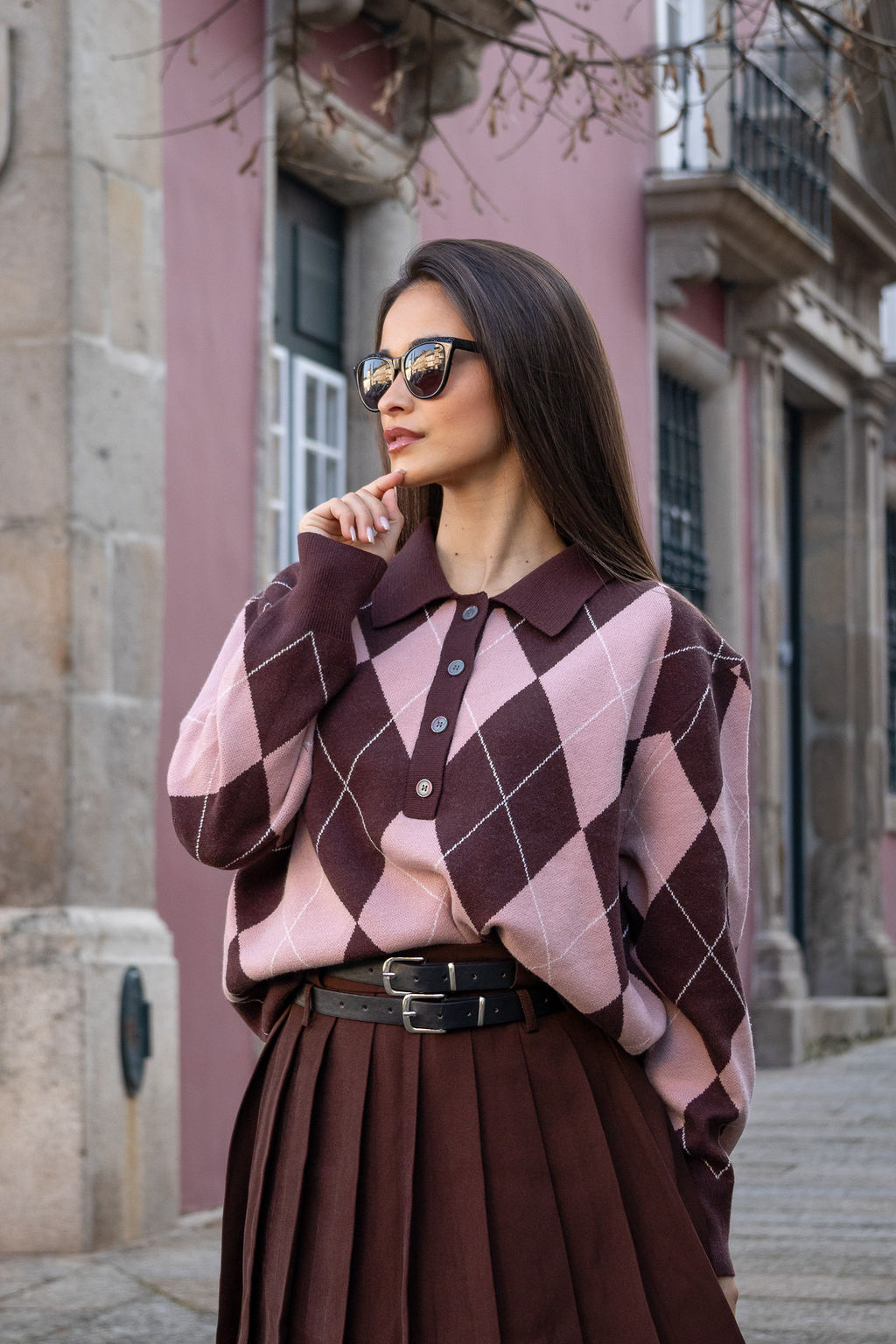 O design destaca-se pelo padrão clássico de losangos em tons de castanho e rosa, reinterpretado de forma moderna e feminina. A gola subida com abertura em botões confere versatilidade e permite ajustar o decote conforme o estilo pretendido. Os punhos e a bainha canelados reforçam a estrutura da camisola, garantindo um caimento impecável e maior definição.