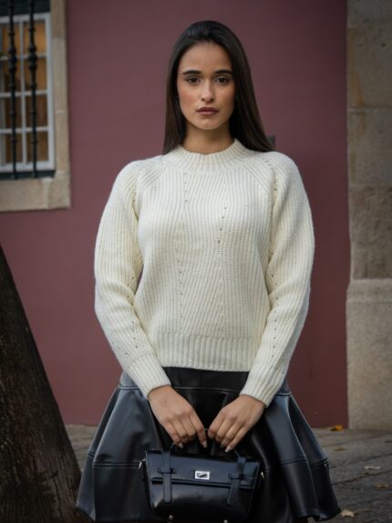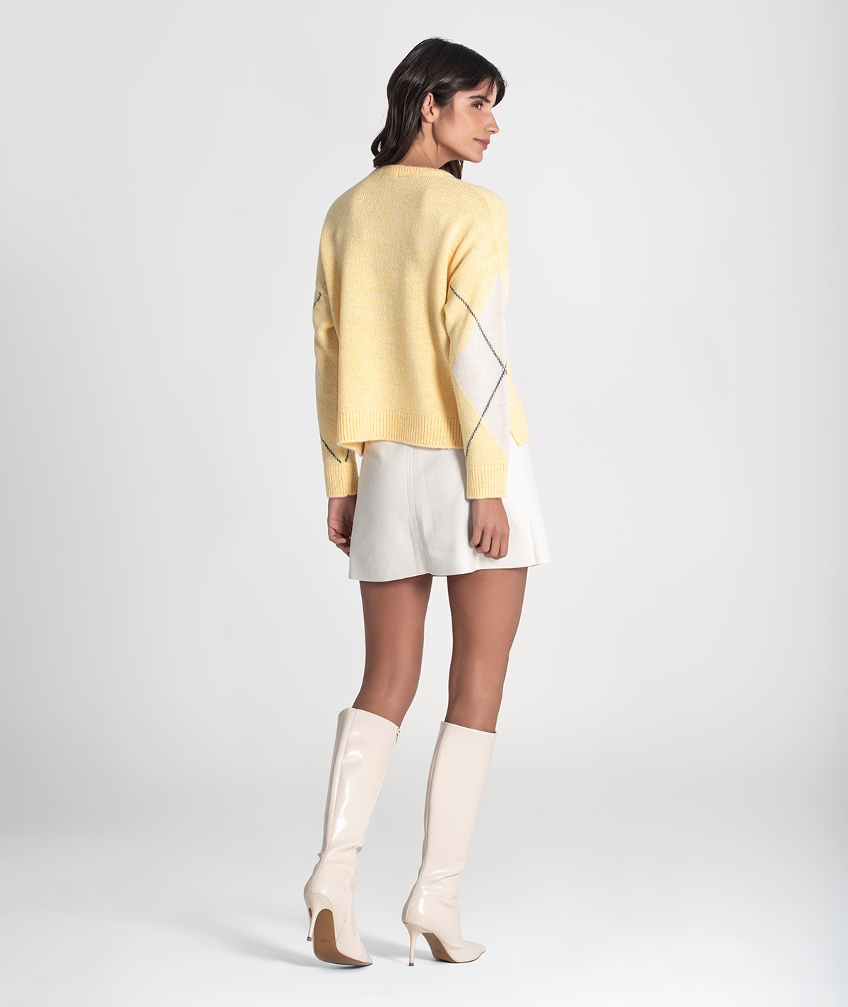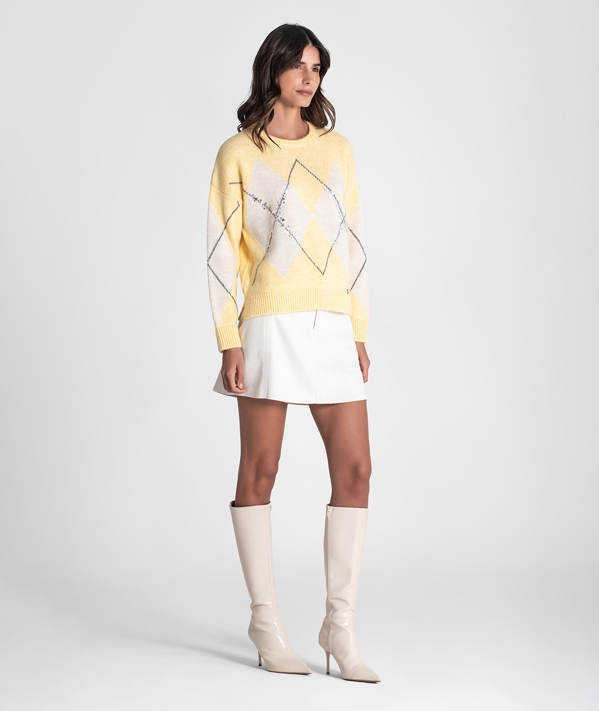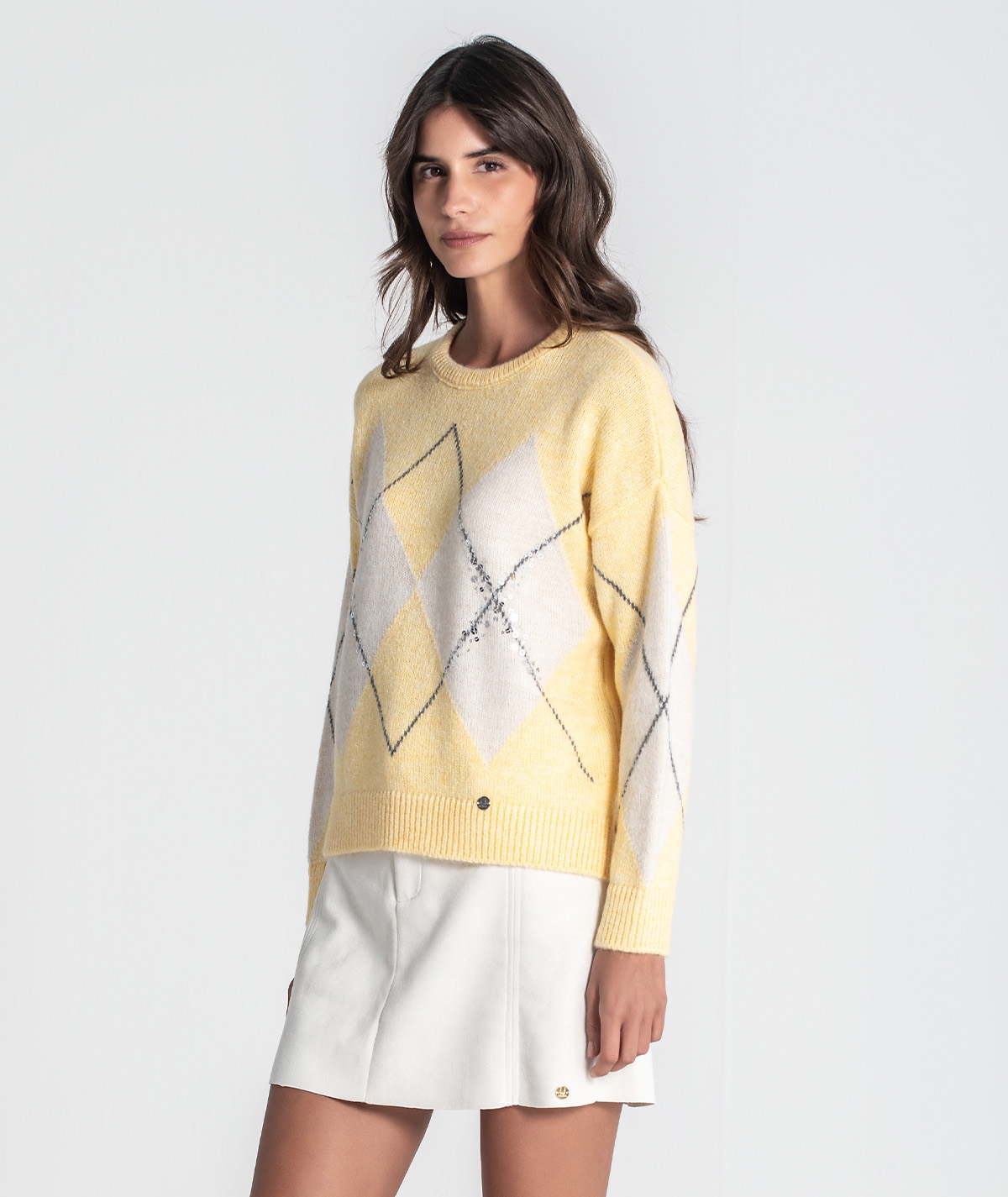 O padrão geométrico em tons suaves cria um visual elegante e luminoso, enquanto as lantejoulas aplicadas ao longo das linhas acrescentam pontos discretos de brilho, elevando a malha sem exagerar. O acabamento canelado no decote, punhos e base reforça a estrutura e assegura um cair impecável.