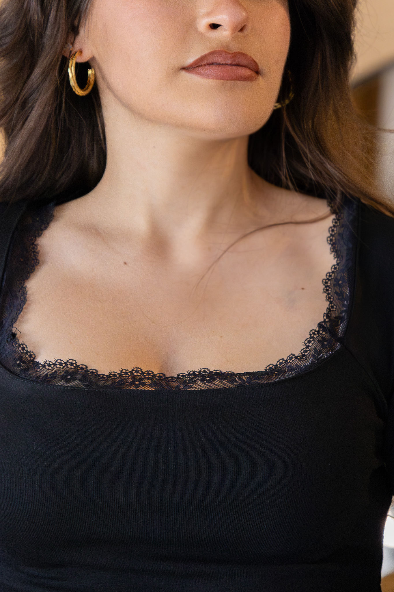 Camisola em tom preto, de design delicado e feminino, que se destaca pelo seu elegante decote quadrado emoldurado por aplicações em renda fina, criando um visual romântico, sofisticado e intemporal. A renda estende-se harmoniosamente pelo decote, punhos e bainha, acrescentando leveza, detalhe e um acabamento premium à peça.