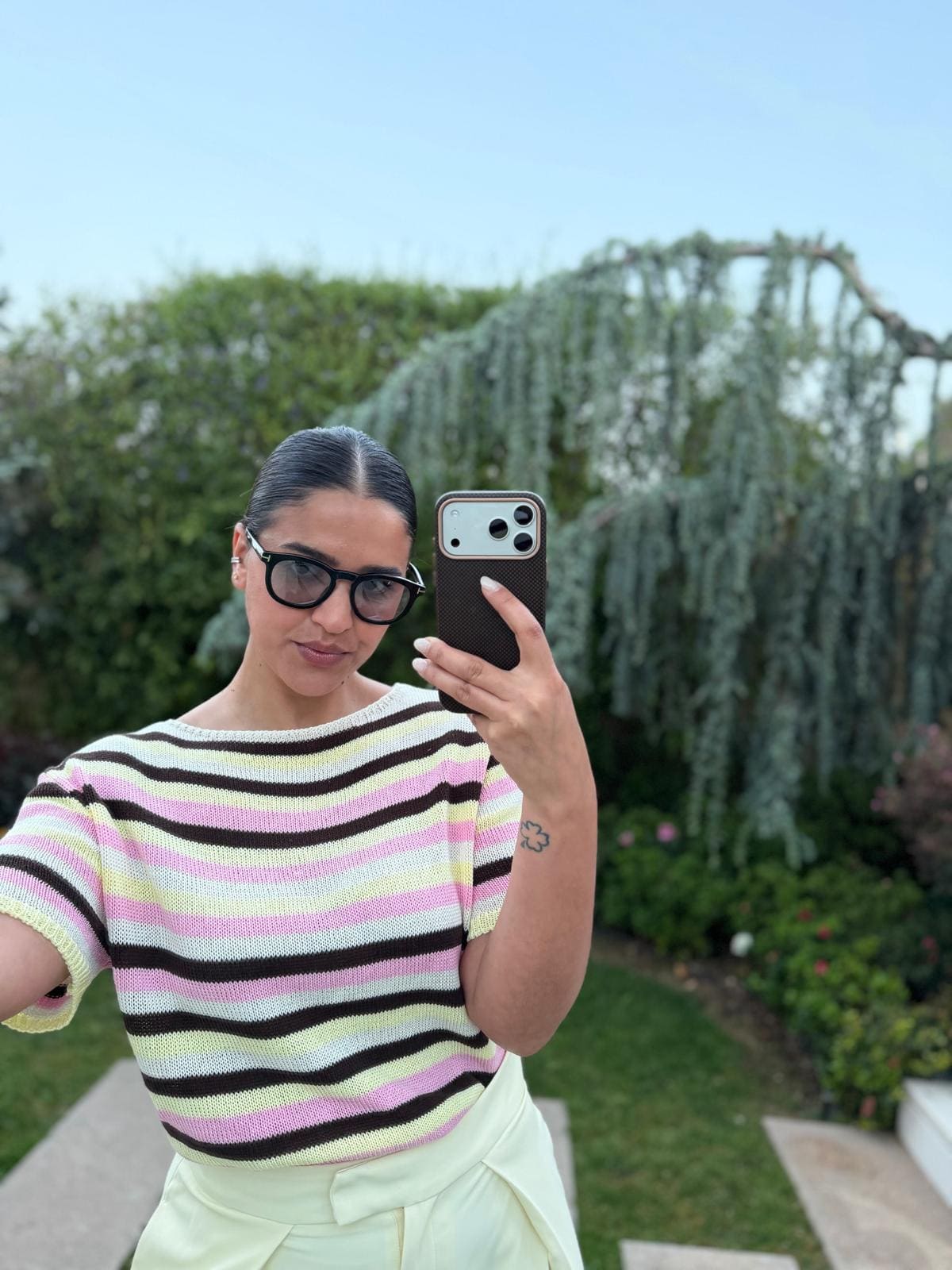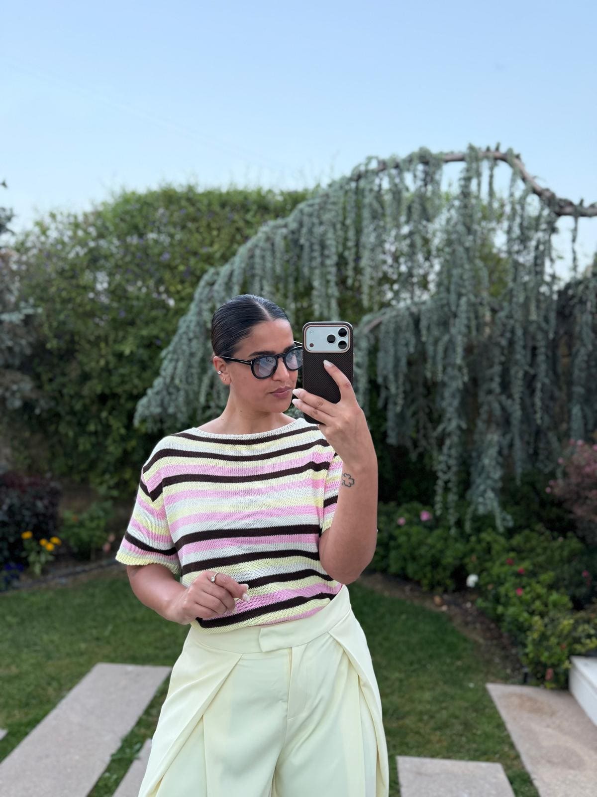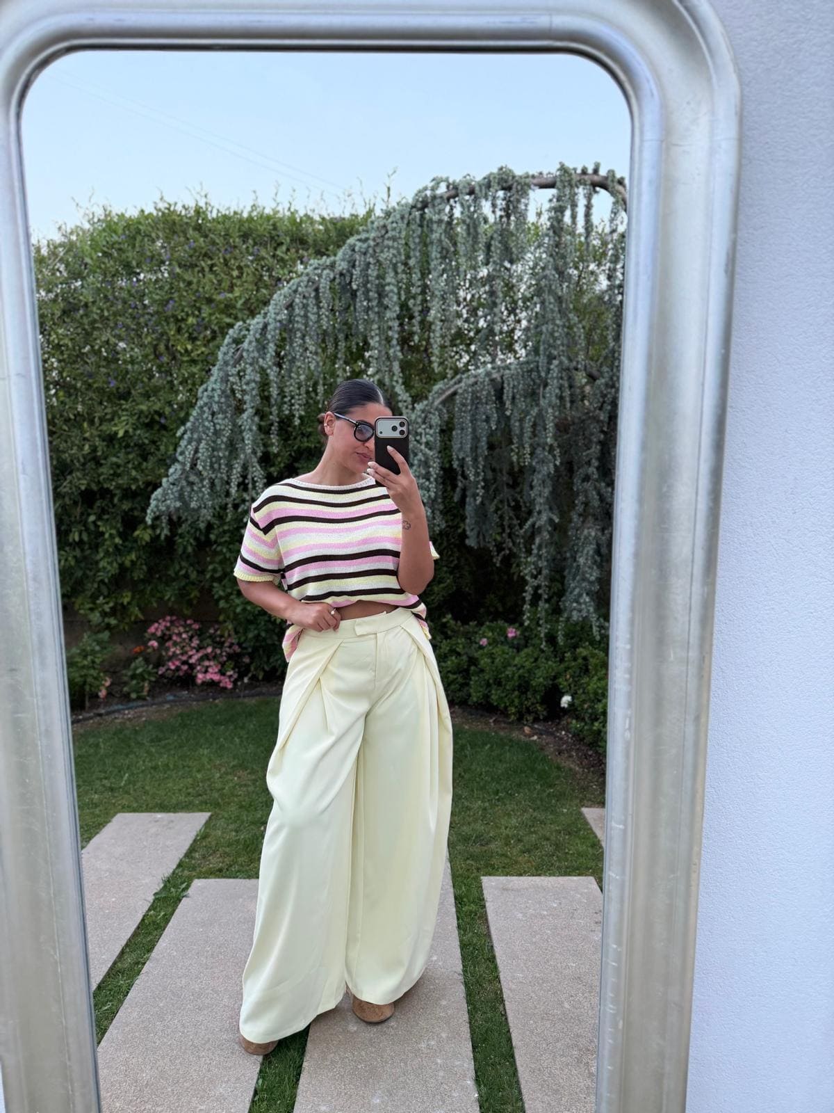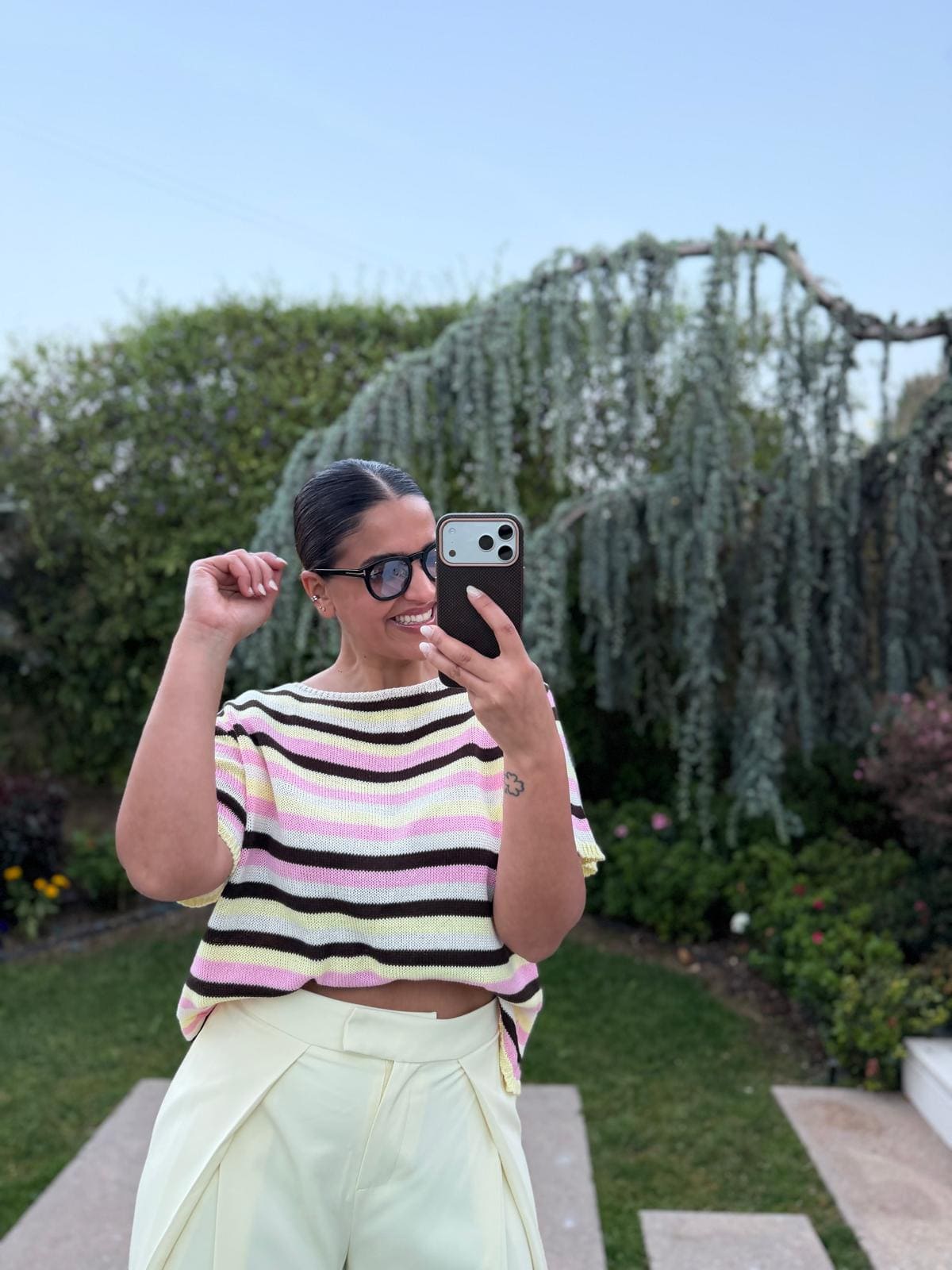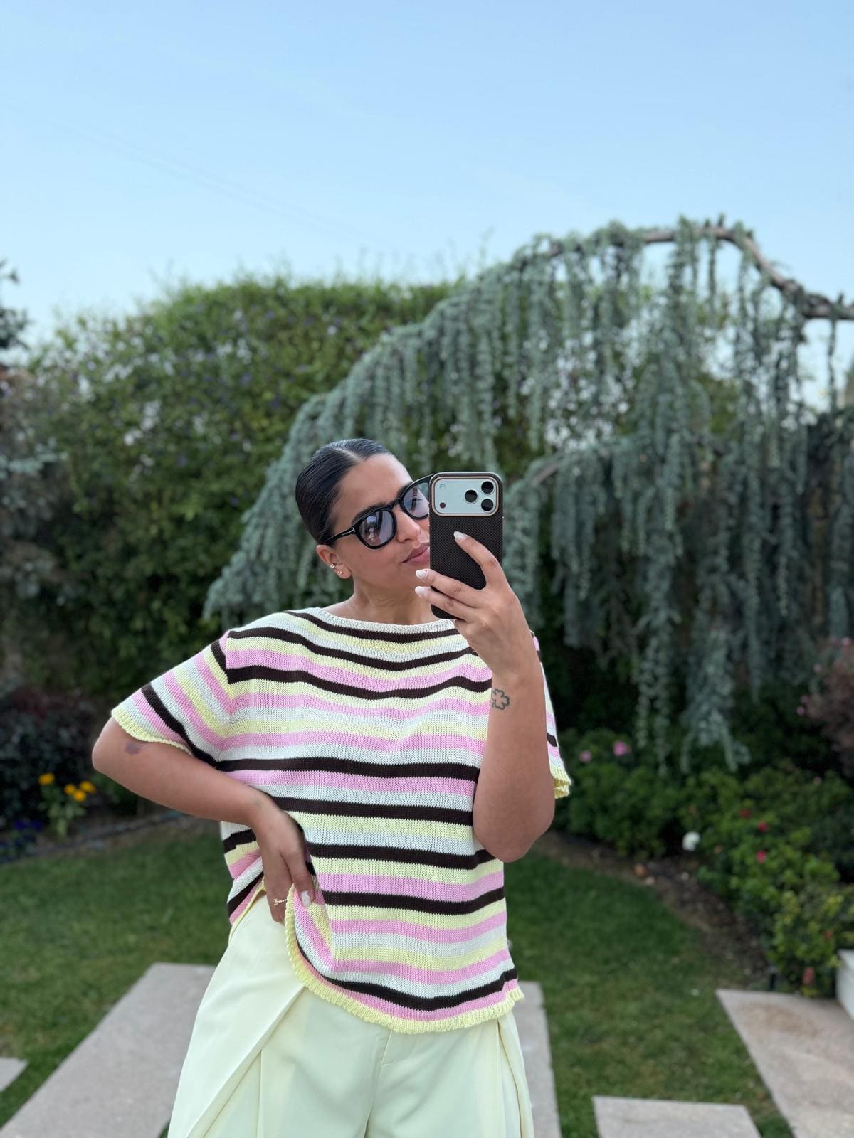 Camisola de malha às riscas multicolor Ponto Chic, confecionada em malha leve e confortável (50% algodão, 50% acrílico), ideal para um look descontraído com um toque divertido e moderno. A combinação de cores suaves com contraste cria uma peça visualmente marcante mas fácil de conjugar.