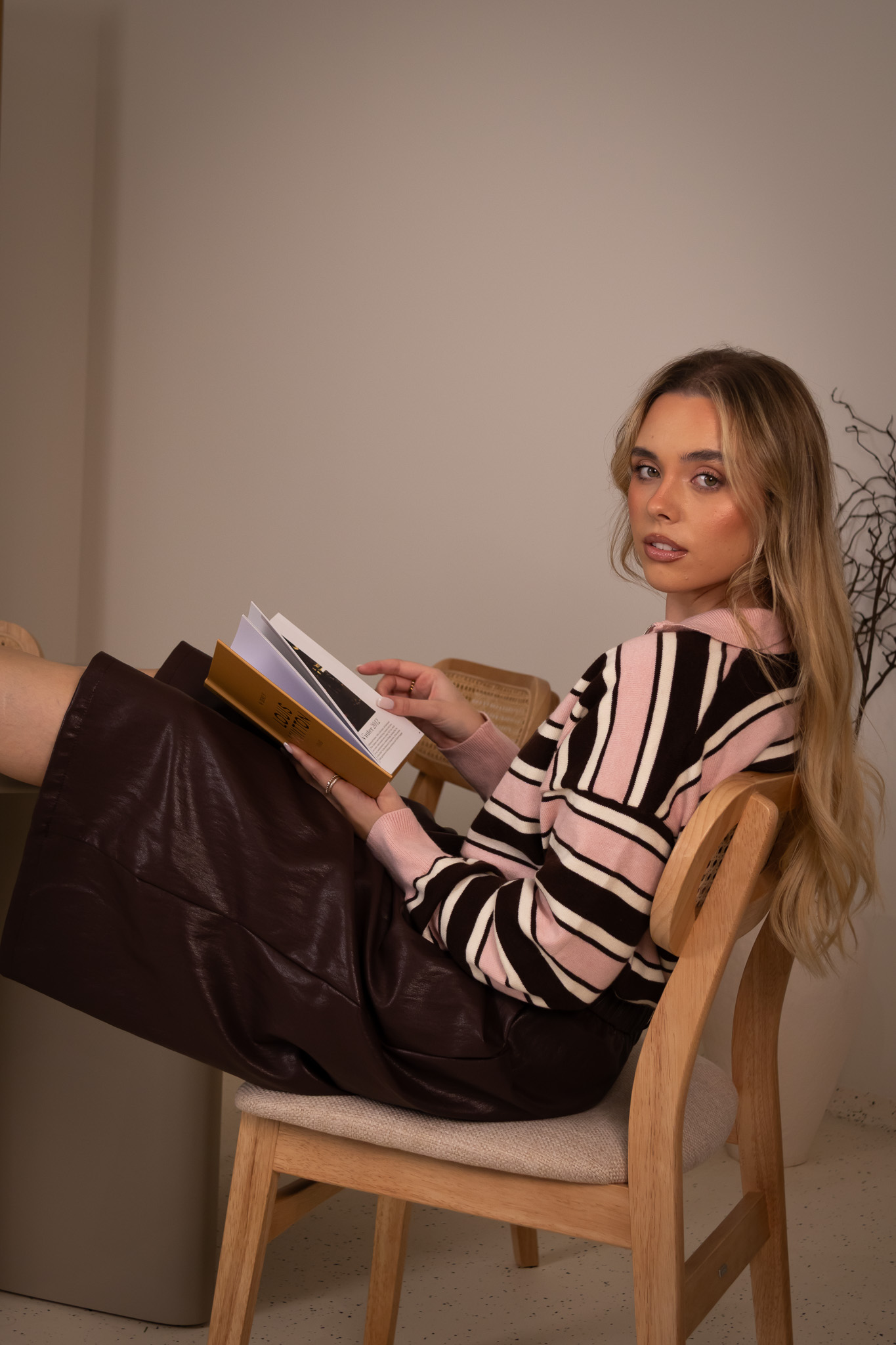 O modelo apresenta gola subida com fecho frontal e riscas em contraste, num equilíbrio harmonioso entre o rosa suave e o castanho profundo. Os acabamentos canelados nos punhos e na bainha conferem um toque cuidado e elegante.