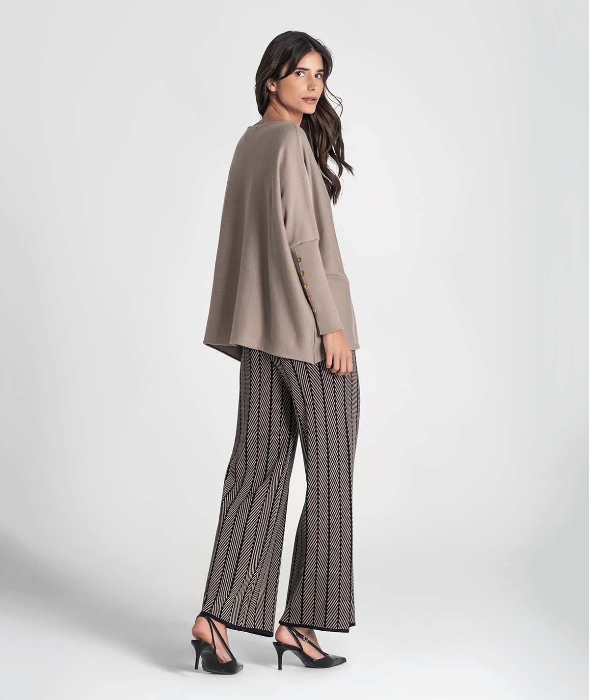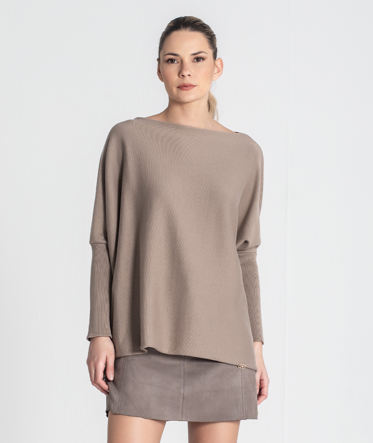 Camisola cru estilo oversized. Punho alto com aplicação de botões dourados. Decote á barco. Composição: 67% Liocel 33% Algodão