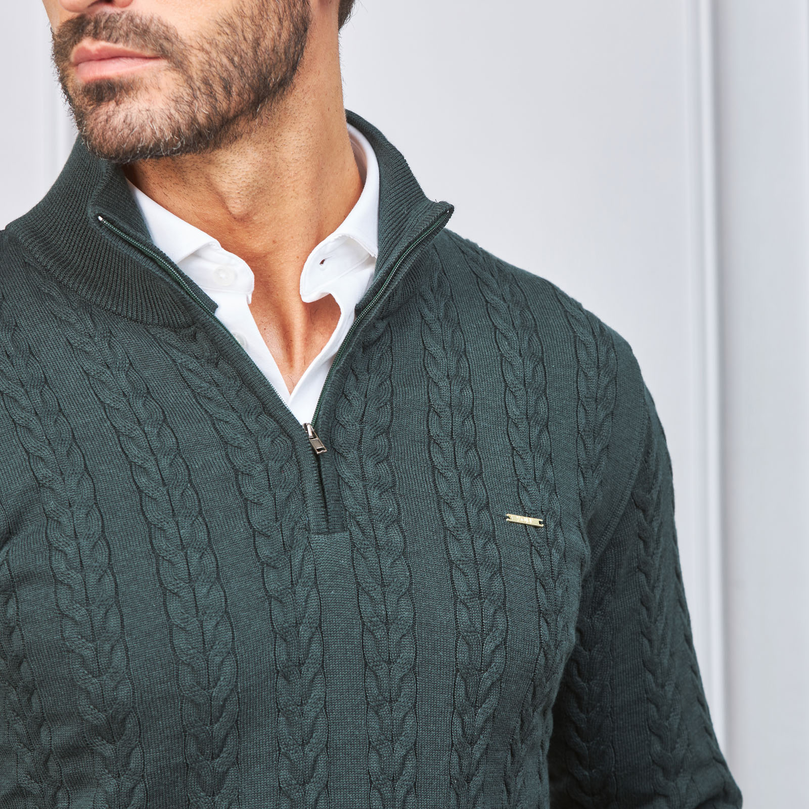 Com uma estrutura ligeiramente ajustada ao corpo, esta camisola valoriza a silhueta masculina sem comprometer o conforto. O tom verde escuro reforça a versatilidade da peça, fácil de combinar com calças em tons neutros, ganga ou bege, tornando-a um essencial de guarda-roupa que atravessa estações e tendências.