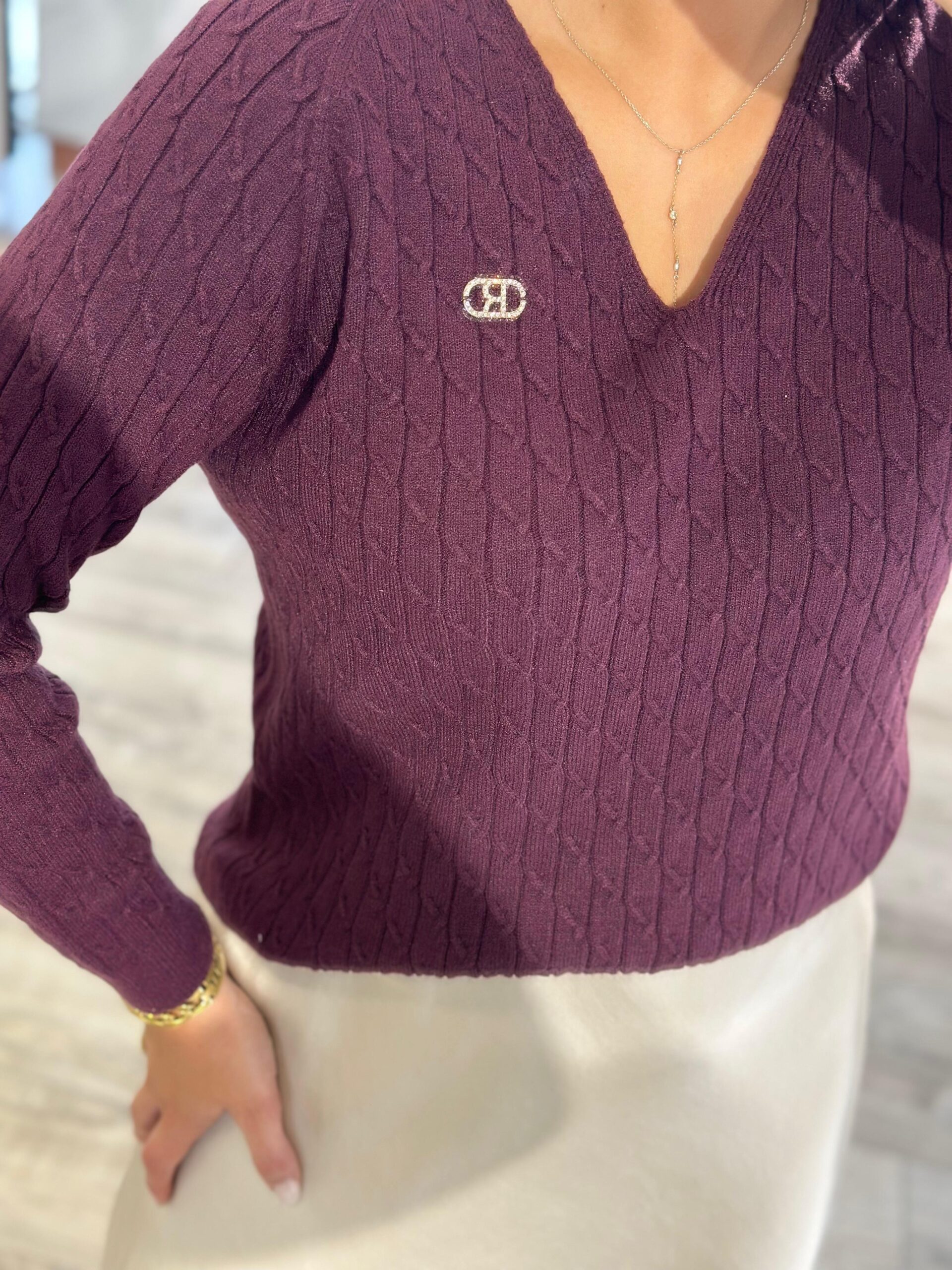 O padrão trançado destaca-se pela delicadeza e sofisticação, enquanto o decote em V acrescenta feminilidade e alonga a silhueta. O detalhe metálico com o logótipo da marca dá-lhe um acabamento distinto e elegante.