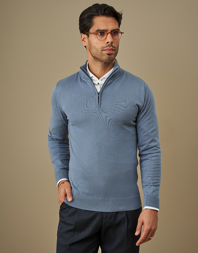O destaque da peça é o meio fecho frontal, que permite ajustar o decote conforme o estilo ou a ocasião — mais aberta para um visual descontraído ou subida para maior proteção em dias frios. A gola subida acrescenta um ar sofisticado e contemporâneo, tornando a camisola versátil tanto para coordenados casuais como para looks mais arrumados.