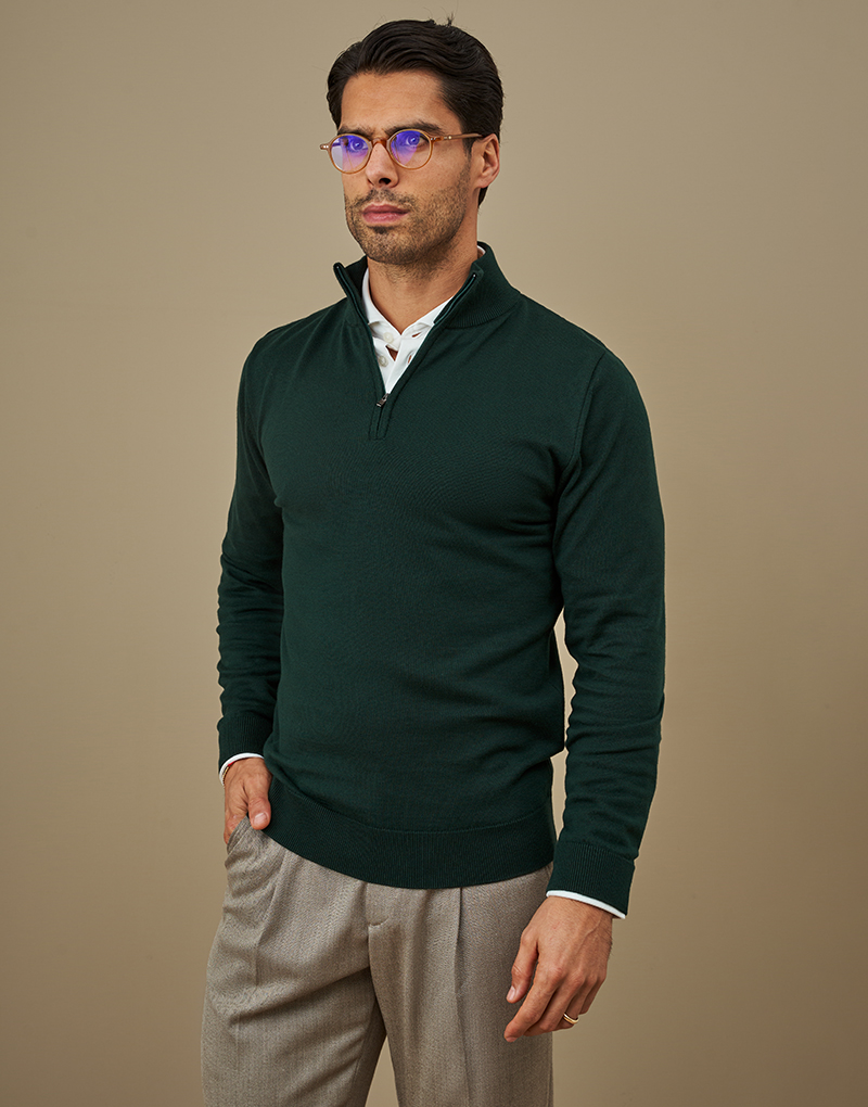 O tom verde-escuro reforça a presença, sobriedade e modernidade da peça, mantendo-a fácil de conjugar com jeans, chinos ou sobreposta a uma camisa. Os punhos e a bainha canelados garantem durabilidade e estrutura, preservando o fit ao longo do uso.