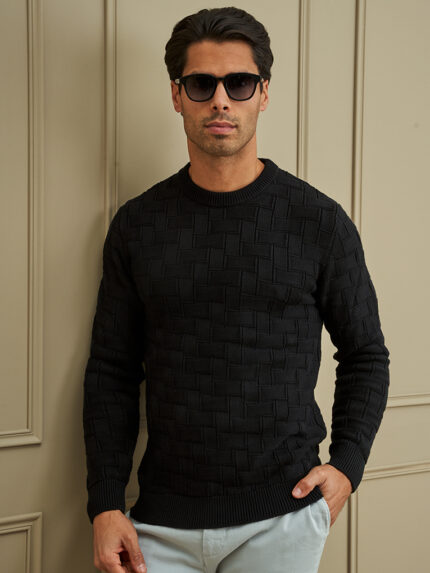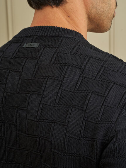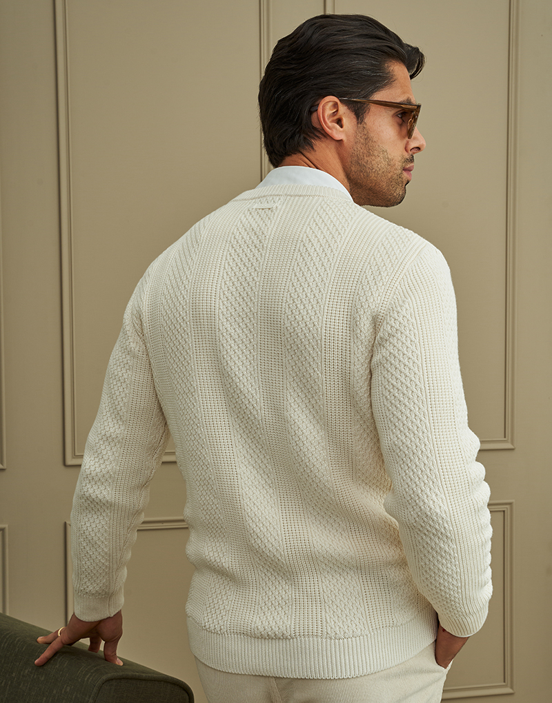 O tricot apresenta um padrão trabalhado e uniforme, elevando a peça sem exageros e garantindo um cair impecável. O decote redondo, os punhos canelados e a base ajustada reforçam a estética clássica, permitindo uma silhueta moderna e bem definida.