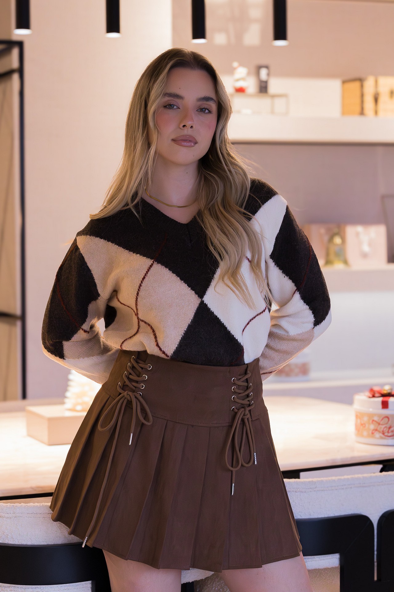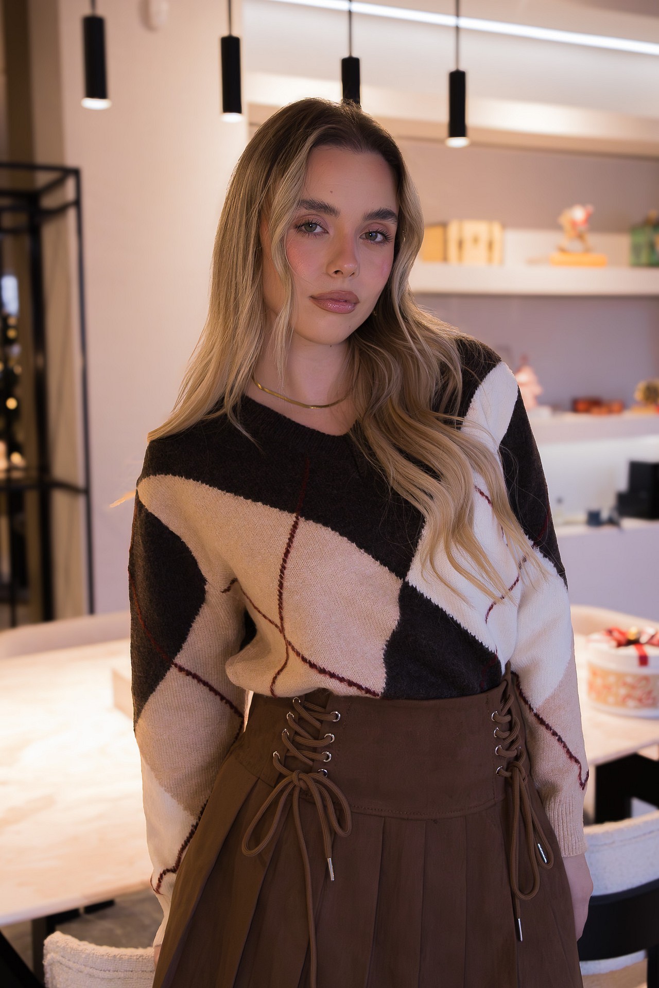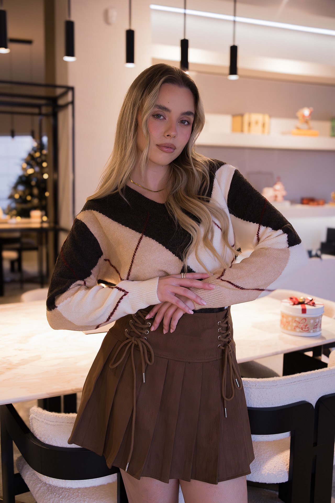 CAMISOLA TRICOT GEOMÉTRICA CASTANHO E CRU PONTO CHIC
