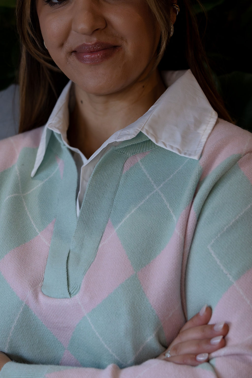 CAMISOLA VERDE ÁGUA COM PADRÃO LOSANGOS E GOLA CAMISA PONTO CHIC